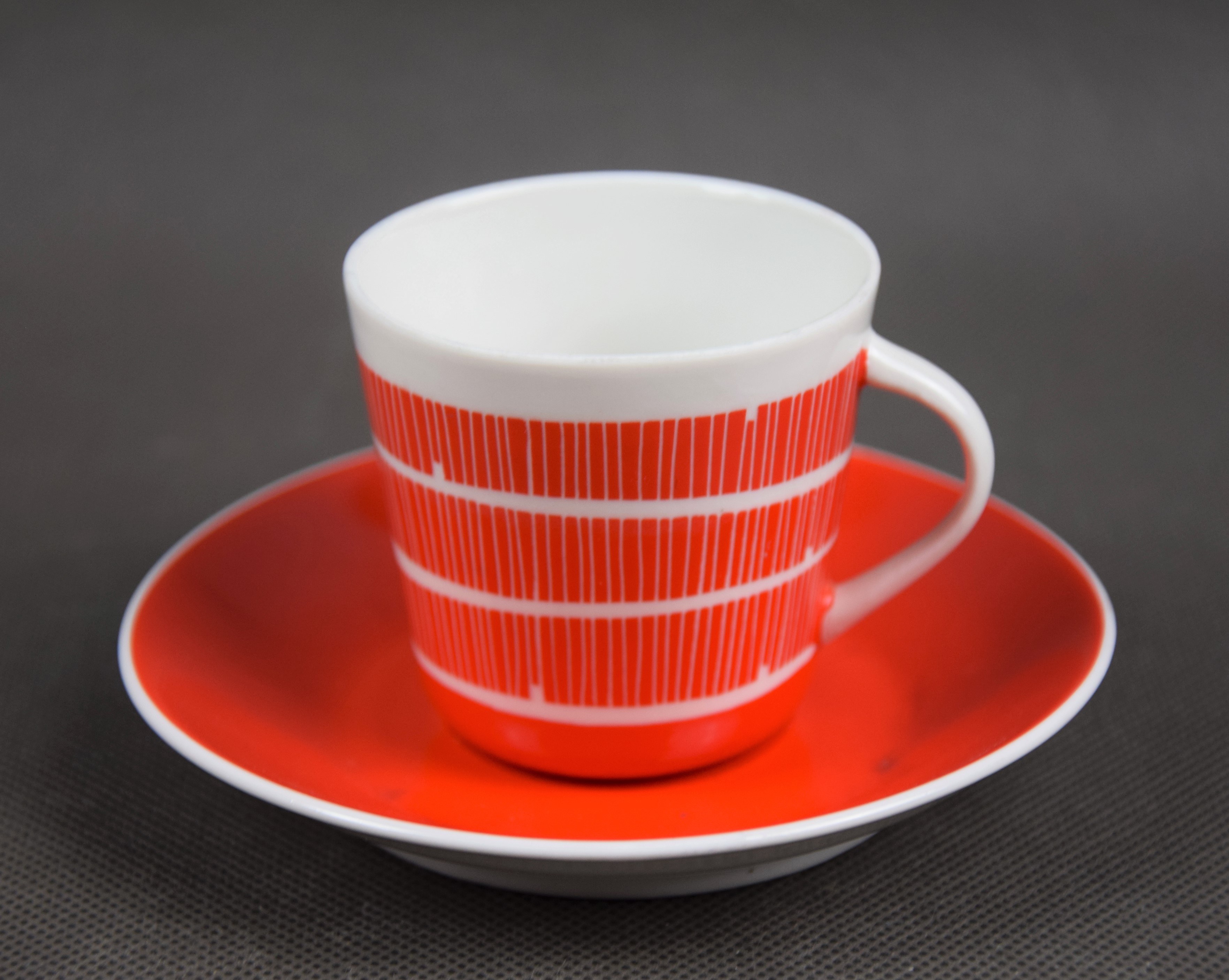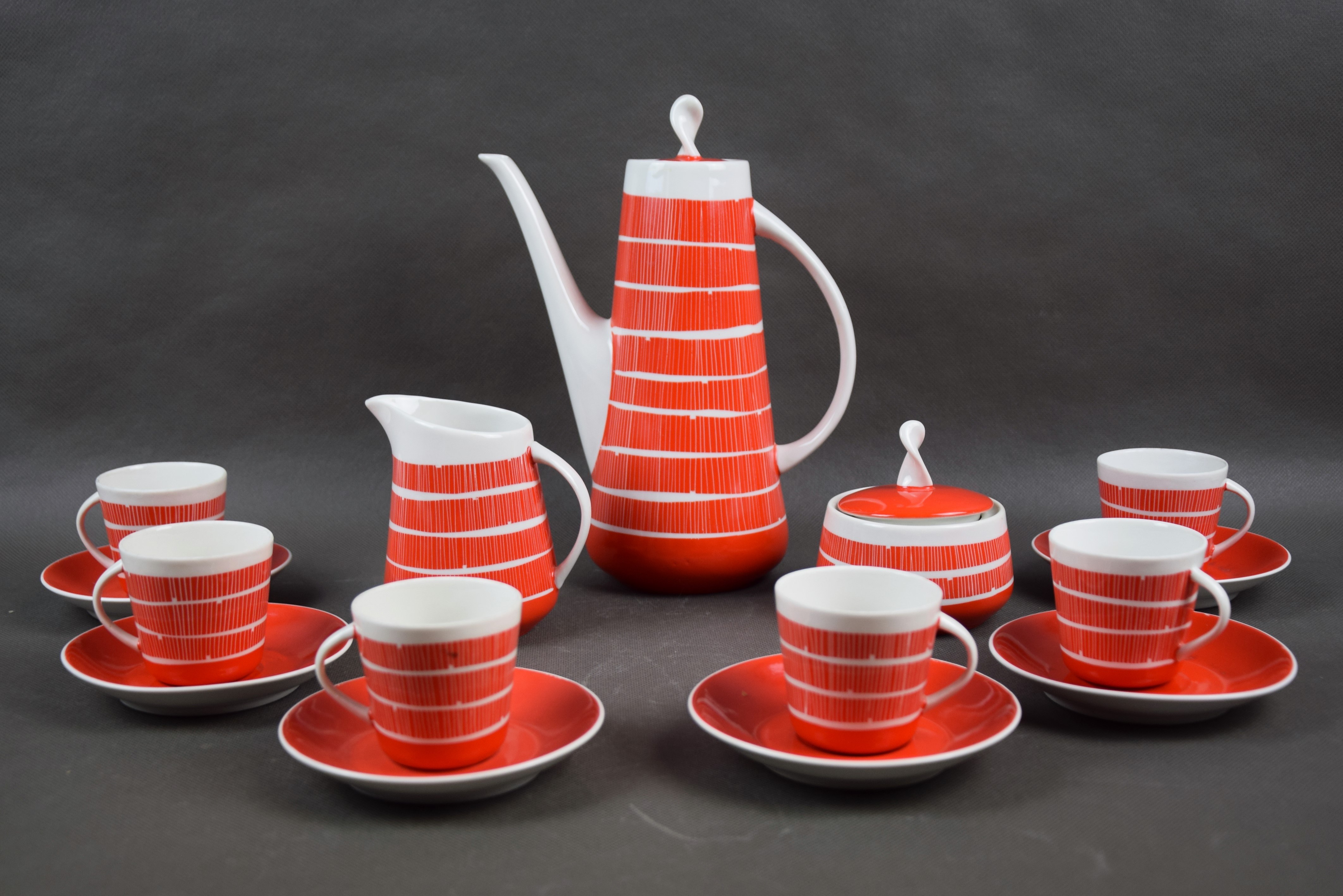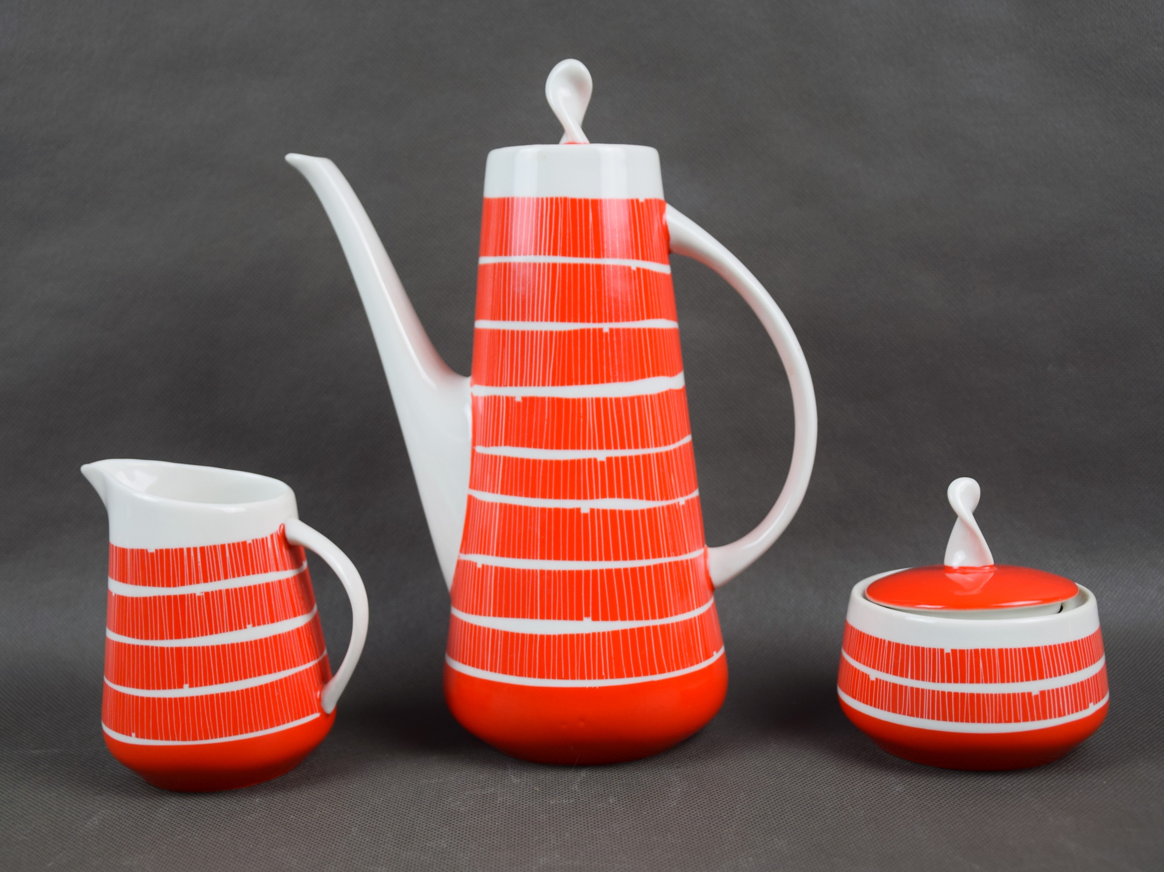 Porcelanowy, kolekcjonerski serwis do kawy „Prometeusz”. Projekt: Danuta Duszniak (ur. 1926). Zakłady Porcelany i Porcelitu w Chodzieży. Lata 60-te. XX w. Malatura natrysk wybierany. Stan bardzo dobry. Niewielkie zmatowienia na spodkach widoczne na zdjęciach oraz pokrywka cukiernicy nie do końca pasuje do korpusu cukiernicy. Tak jest od nowości tego serwisu (serwis w rękach jednej rodziny od lat 60-tych). Każdy element sygnowany znakiem wytwórni oraz wypisem. Nie ma uszkodzeń mechanicznych.