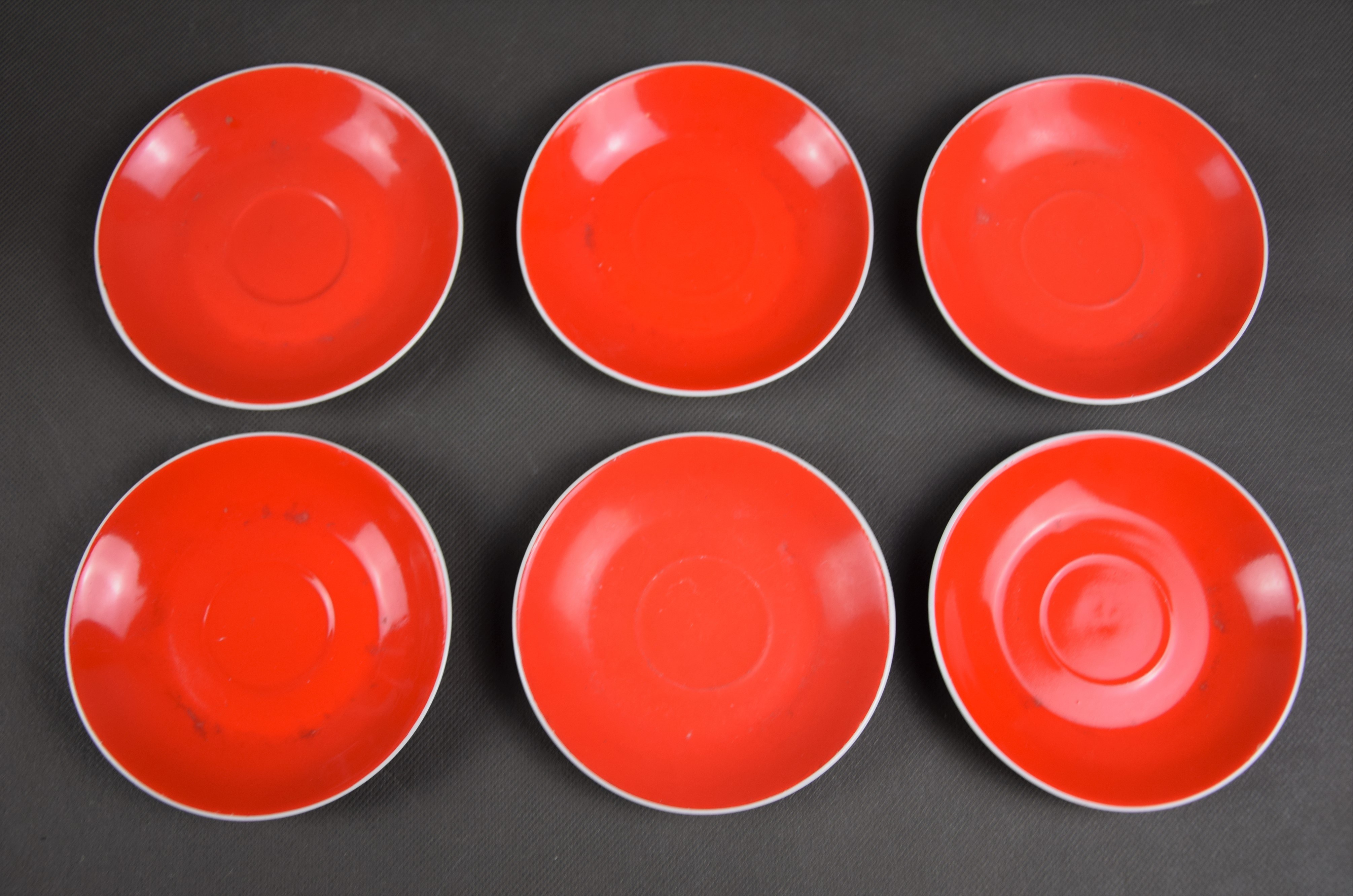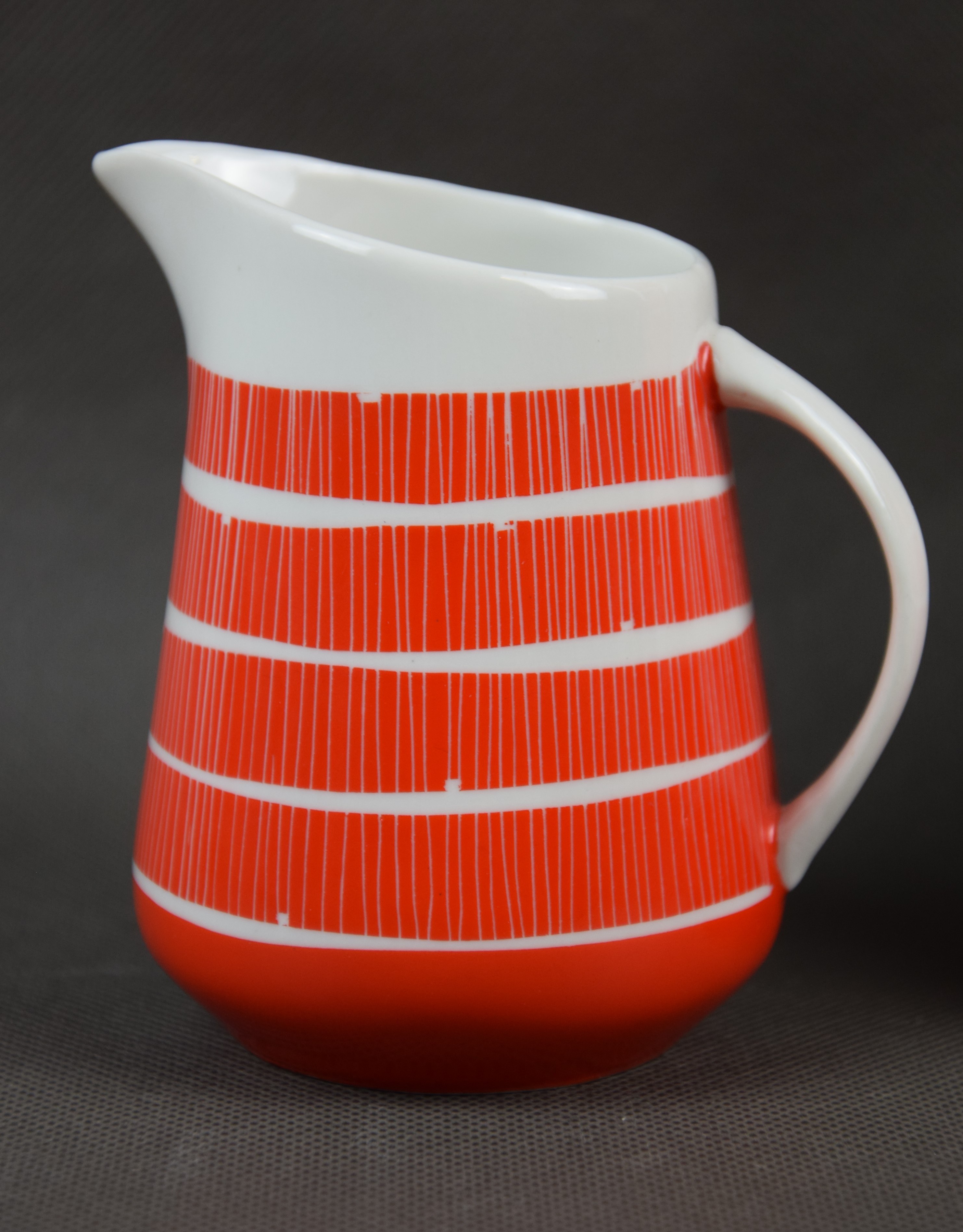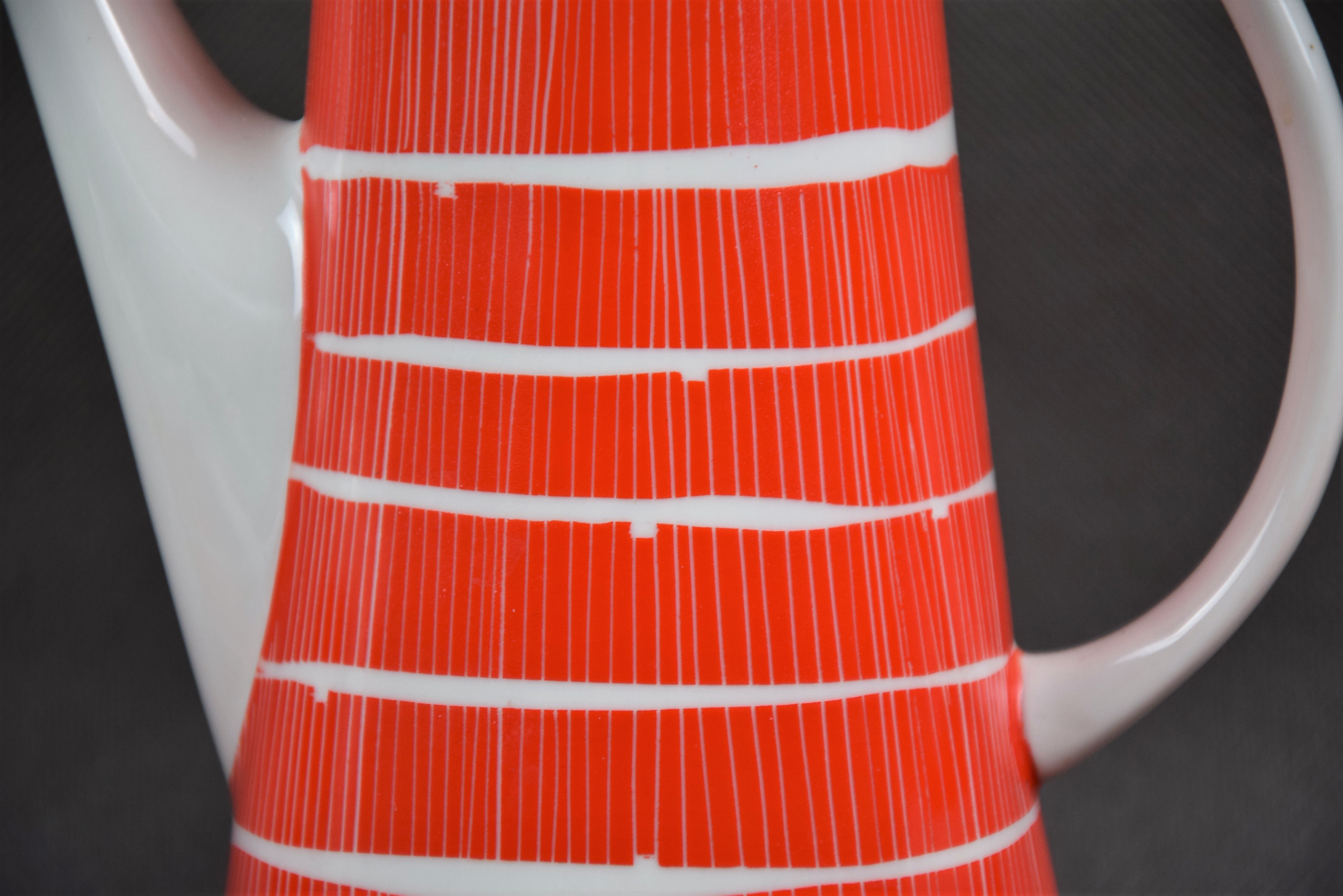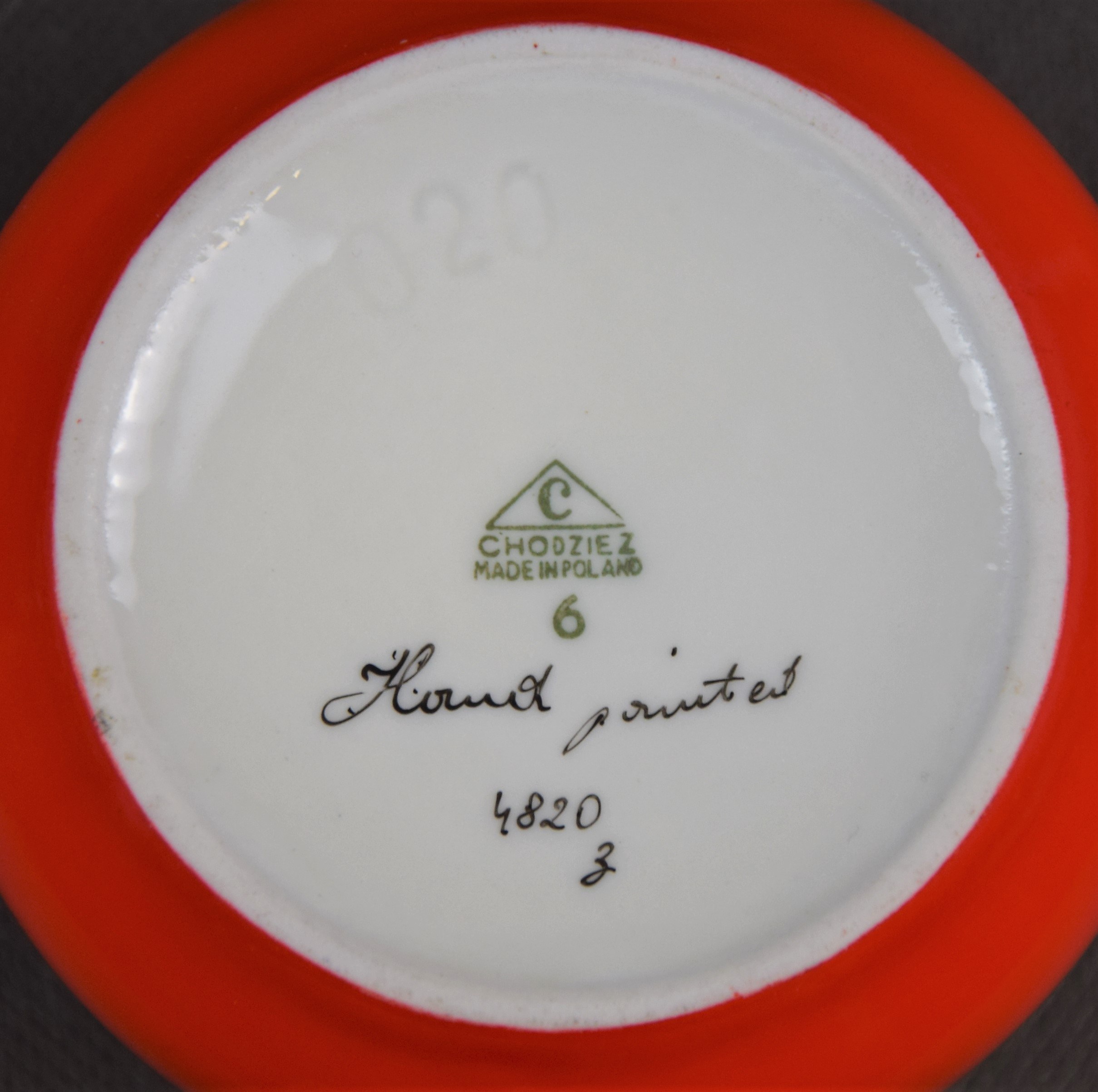 Porcelanowy, kolekcjonerski serwis do kawy „Prometeusz”. Projekt: Danuta Duszniak (ur. 1926). Zakłady Porcelany i Porcelitu w Chodzieży. Lata 60-te. XX w. Malatura natrysk wybierany. Stan bardzo dobry. Niewielkie zmatowienia na spodkach widoczne na zdjęciach oraz pokrywka cukiernicy nie do końca pasuje do korpusu cukiernicy. Tak jest od nowości tego serwisu (serwis w rękach jednej rodziny od lat 60-tych). Każdy element sygnowany znakiem wytwórni oraz wypisem. Nie ma uszkodzeń mechanicznych.
