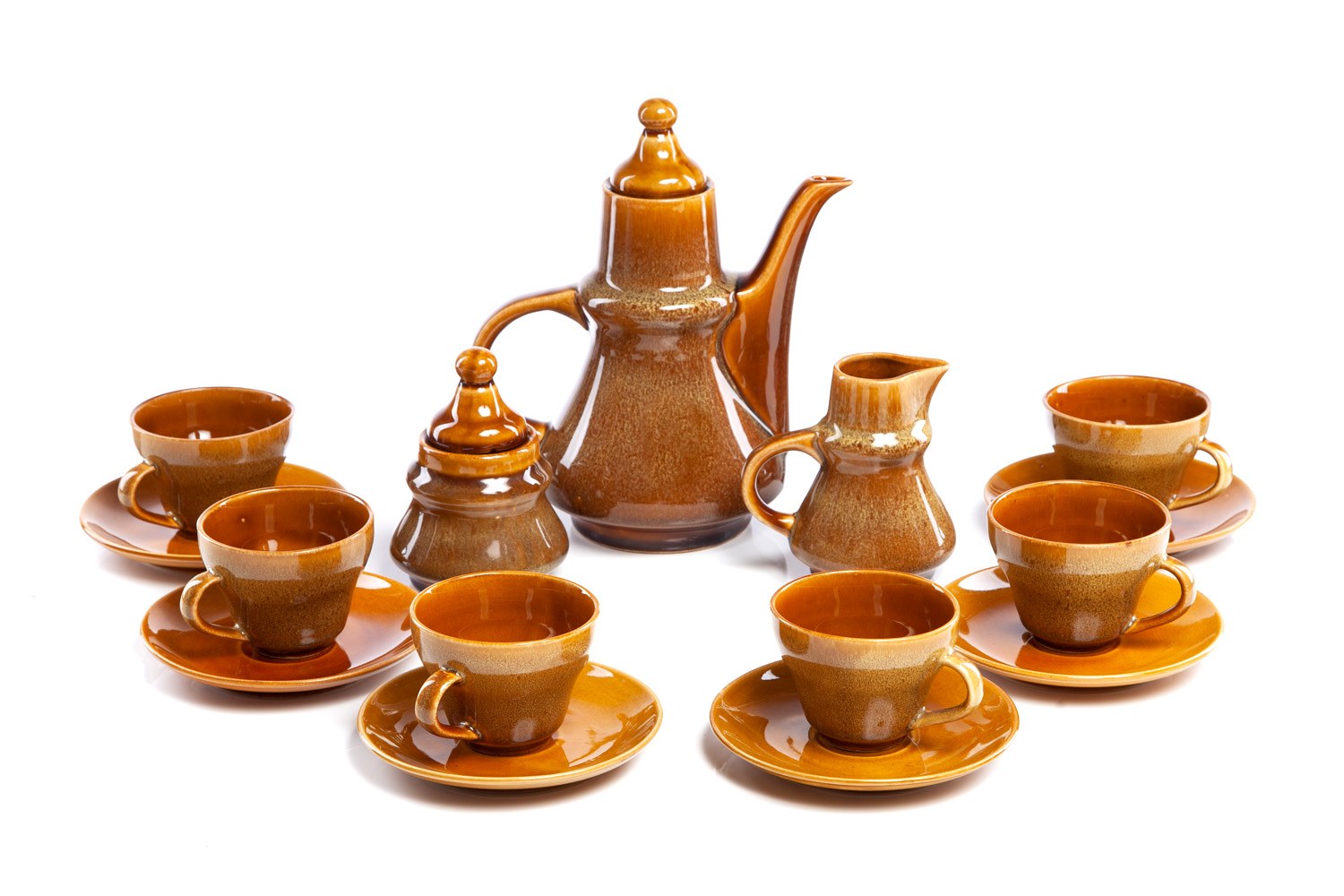 w skład zestawu wchodzą: dzbanek: 21 cm: 12 cm, mlecznik: 1o cm, 6 filiżanek: wysokość: 5,5 cm, średnica: 7,5 cm, 6 spodków: średnica: 13 cm.