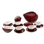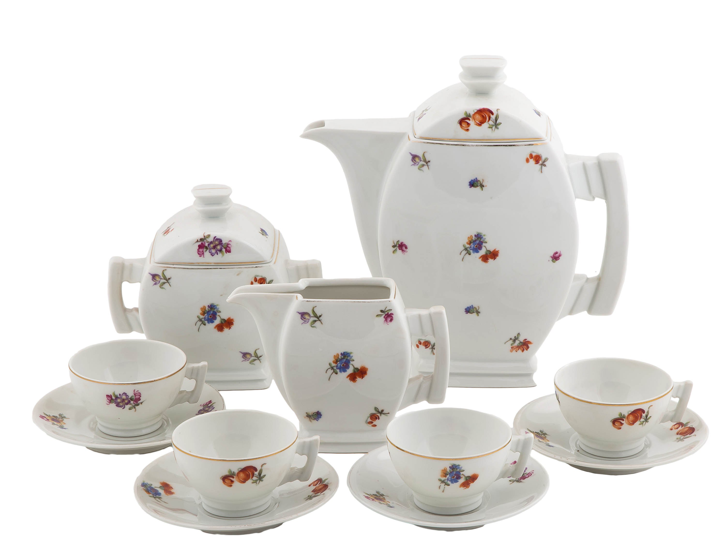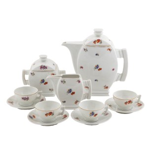 porcelana, nadruk kwiatowy, złocenia, w składzie: dzbanek wys. 21 cm, mlecznik wys. 10 cm, cukiernica wys. 13 cm, cztery filiżanki wys. 4 cm, śr. 7 cm, 5 spodków śr. 11 cm,
