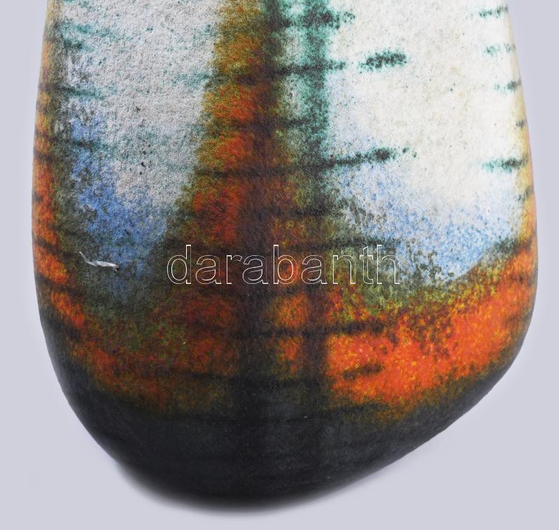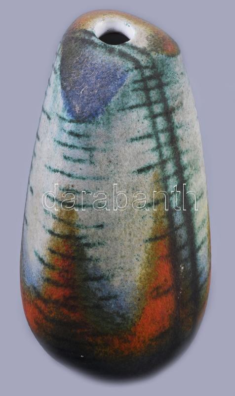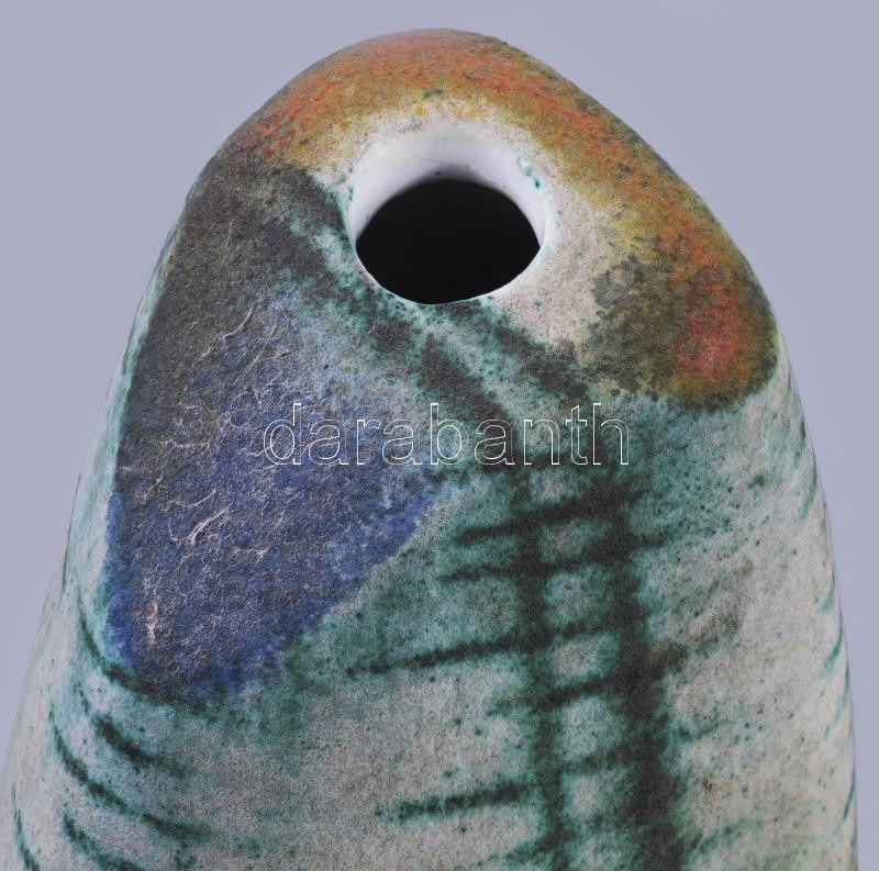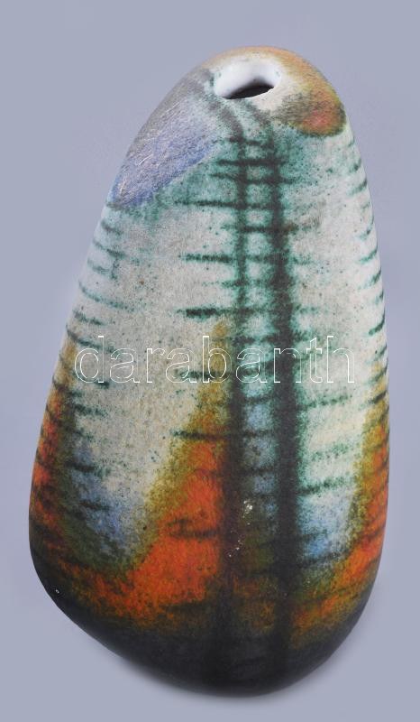 Simó Ágoston (1925-2011): Kavicsváza. Magas hőfokon égetett, rézoxiddal színezett, samottos agyag. Alján jelzett. Hibátlan, élénk színvilággal, m: 26 cm /// "1943-49: Magyar Iparművészeti Főiskola kerámia szak, mestere: Borsos Miklós, Gádor István, Molnár Elek és Ohmann Béla volt. 1957: Iparművészeti Pályázat I. és II. díj; 1960: Iparművészeti Pályázat I. és III. díj; 1985: Magyar Alkotóművészek Országos Egyesülete-díj; 2002: Ferenczy Noémi-díj. 1950-től a Gránit Kőedény és Porcelángyár, 1952-54 között pedig a Kerámia Iparművészeti Szövetkezet tervezőjeként dolgozott. 1954-től szabadfoglalkozású művész. A Siklósi Kerámia szimpóziumon 1972-ben és 1976-ban vett részt. Tevékenységi köre a kerámia teljes területére kiterjed, ezen belül jelentős szerepet kaptak a figurális plasztikák, a murális feladatok, továbbá a cserépkályhák."