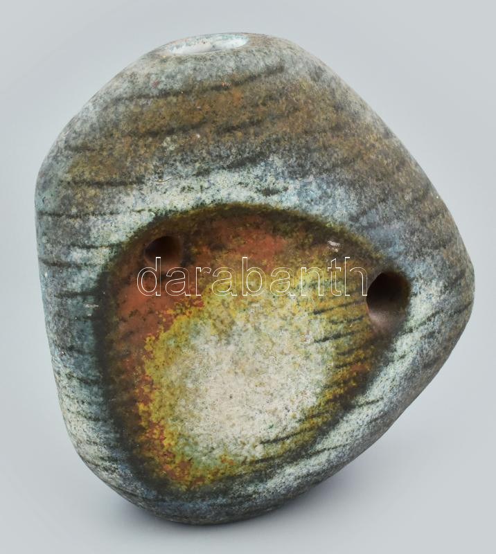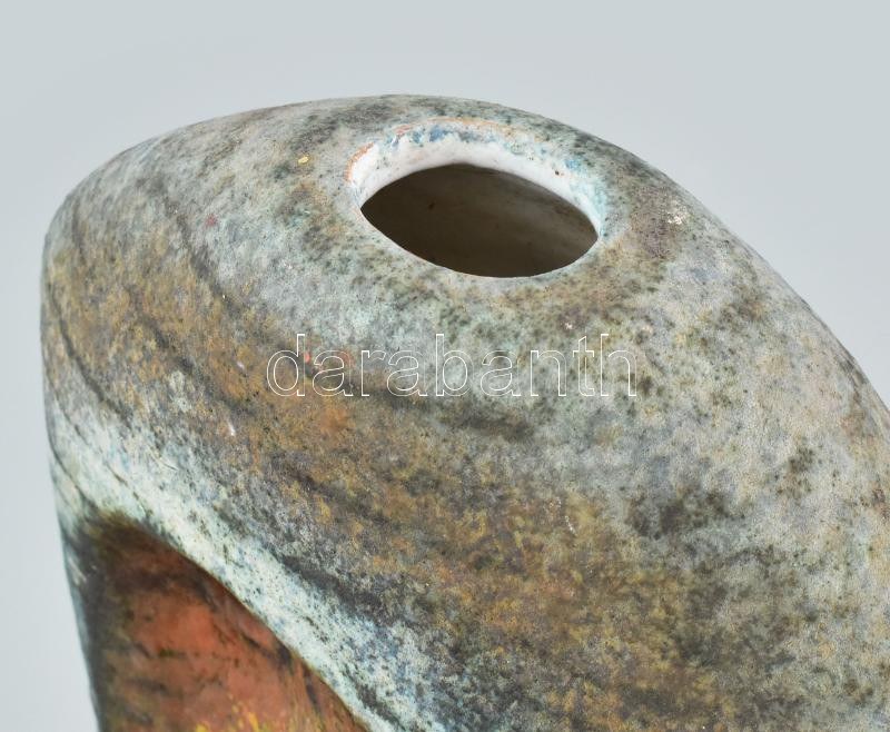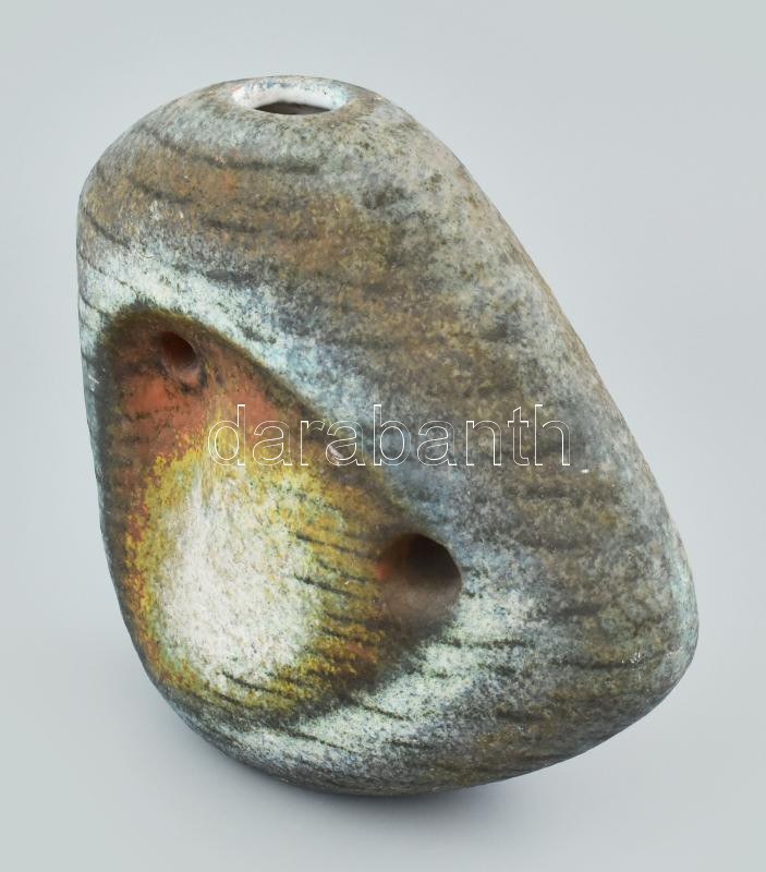 Simó Ágoston (Székelyudvarhely, 1925 - Budapest, 2011) Design váza. Formába öntött, magas hőfokon égetett, rézoxiddal színezett, samottos agyag. Hibátlan. Alján jelzett: masszába karcolt Simó Á. 27x8x27 cm "1943-49: Magyar Iparművészeti Főiskola kerámia szak, mestere: Borsos Miklós, Gádor István, Molnár Elek és Ohmann Béla volt. 1957: Iparművészeti Pályázat I. és II. díj; 1960: Iparművészeti Pályázat I. és III. díj; 1985: Magyar Alkotóművészek Országos Egyesülete-díj; 2002: Ferenczy Noémi-díj. 1950-től a Gránit Kőedény és Porcelángyár, 1952-54 között pedig a Kerámia Iparművészeti Szövetkezet tervezőjeként dolgozott. 1954-től szabadfoglalkozású művész. A Siklósi Kerámia szimpóziumon 1972-ben és 1976-ban vett részt. Tevékenységi köre a kerámia teljes területére kiterjed, ezen belül jelentős szerepet kaptak a figurális plasztikák, a murális feladatok, továbbá a cserépkályhák. A Budapest Előre síelőjeként hatszoros megyei bajnok (1950-52)."