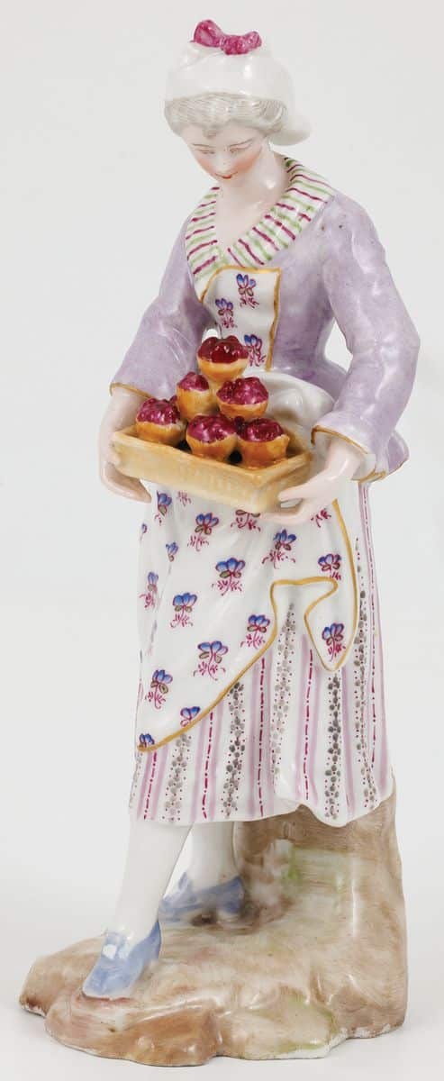 Porcelana, malatury naszkliwne, złocenie; wys. 18 cm Sygnowana: kobaltem podszkliwnie skrzyżowane miecze z odwróconą literą E pomiędzy rękojeściami i jelcami. Naśladownictwo miśnieńskiej serii „Cris de Paris”, przedstawiającej ulicznych paryskich sprzedawców, opartych na rysunkach Christopha Hueta z 1753 r., i modelach Petera Reinicke z 1753-54 Cena wywoławcza 600 Estymacja 1000 - 1200 zapytaj o obiekt