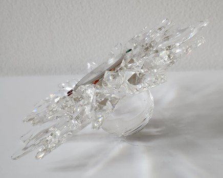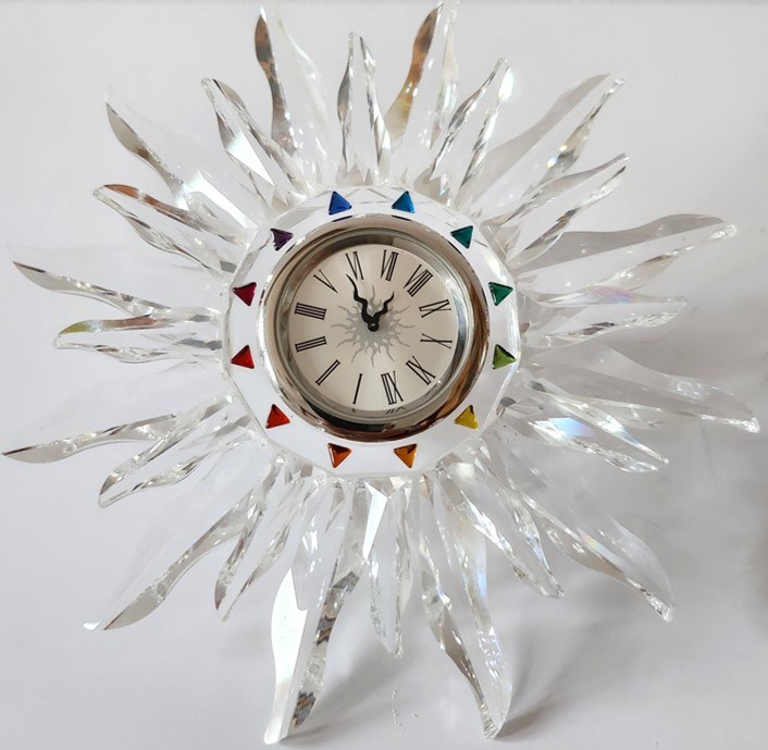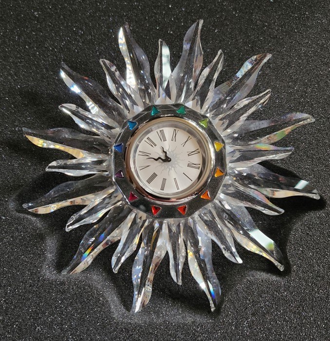 Zegar z ciętego i formowanego kryształu z ok. 1998 r. , tarcza otoczona kolorowymi trójkątami, srebrne tło, rzymskie cyfry godzin, ruchome wskazówki. Numerowany na odwrocie 84014920.