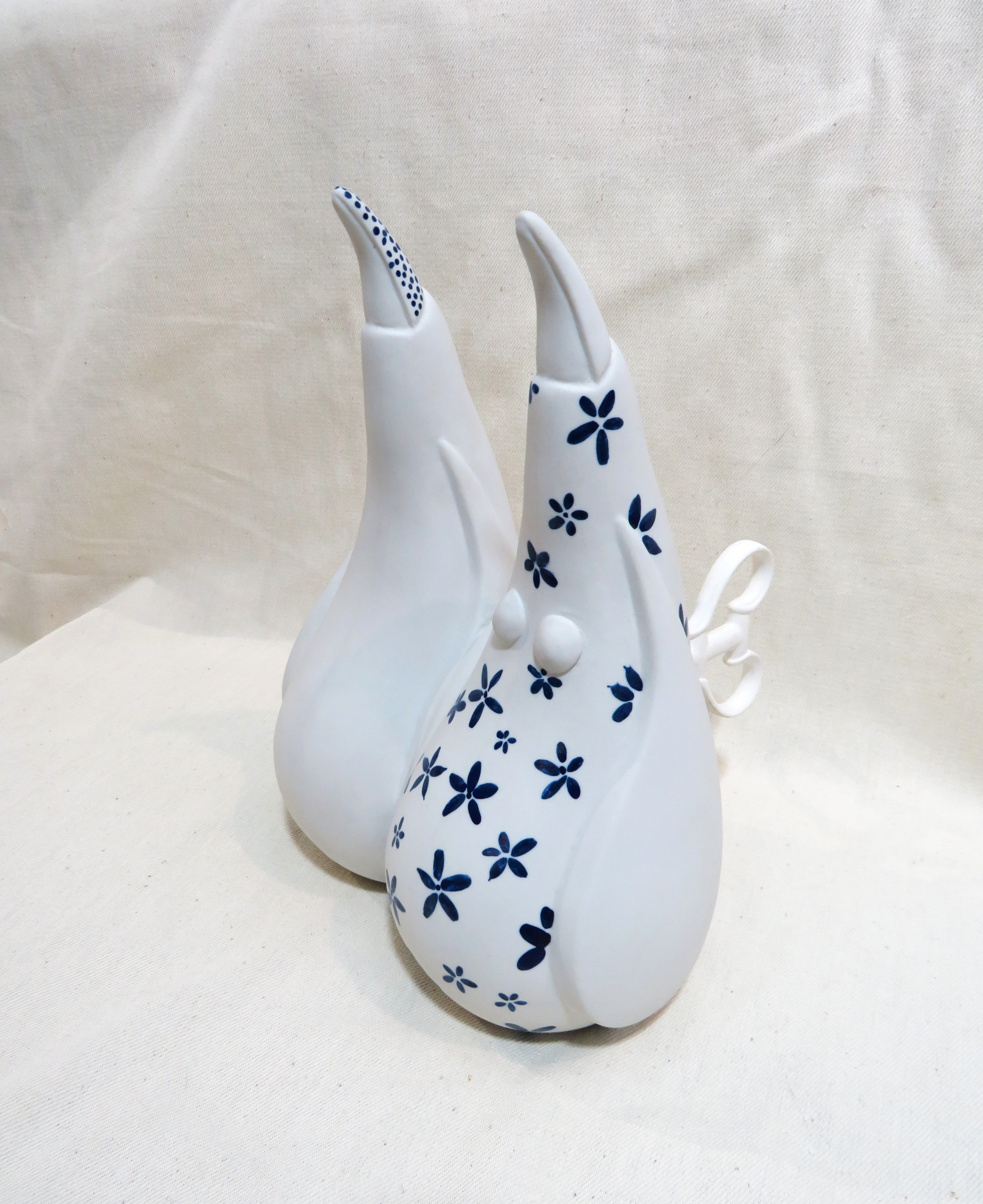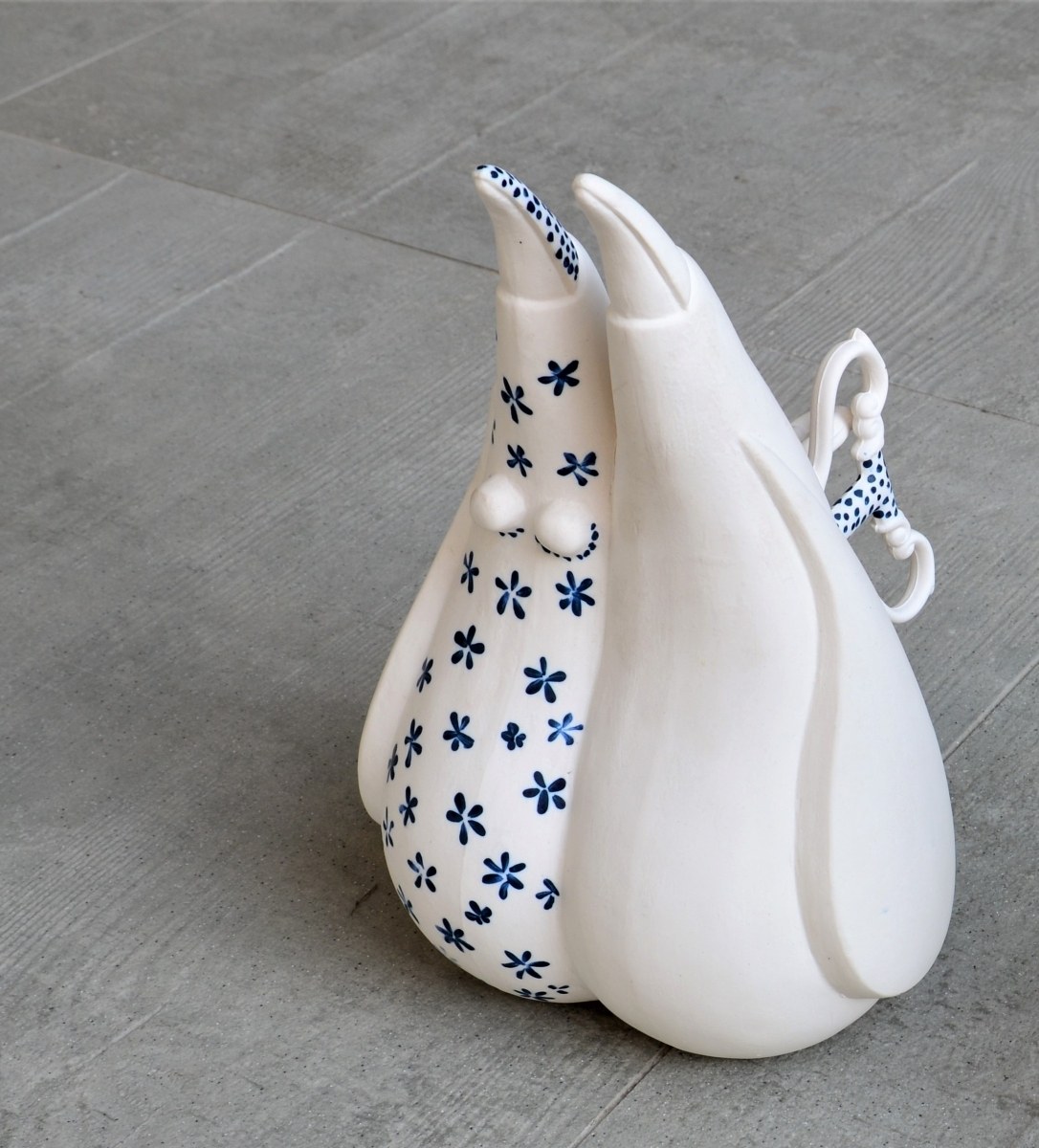 Biała porcelana Limoges, dekorowana kobaltem, wypalana w temperaturze 1250°C, wysokość 23,5 cm, sygnowane na spodzie reliefem W Wolf 21. Jeden z dwóch egzemplarzy autorskich.