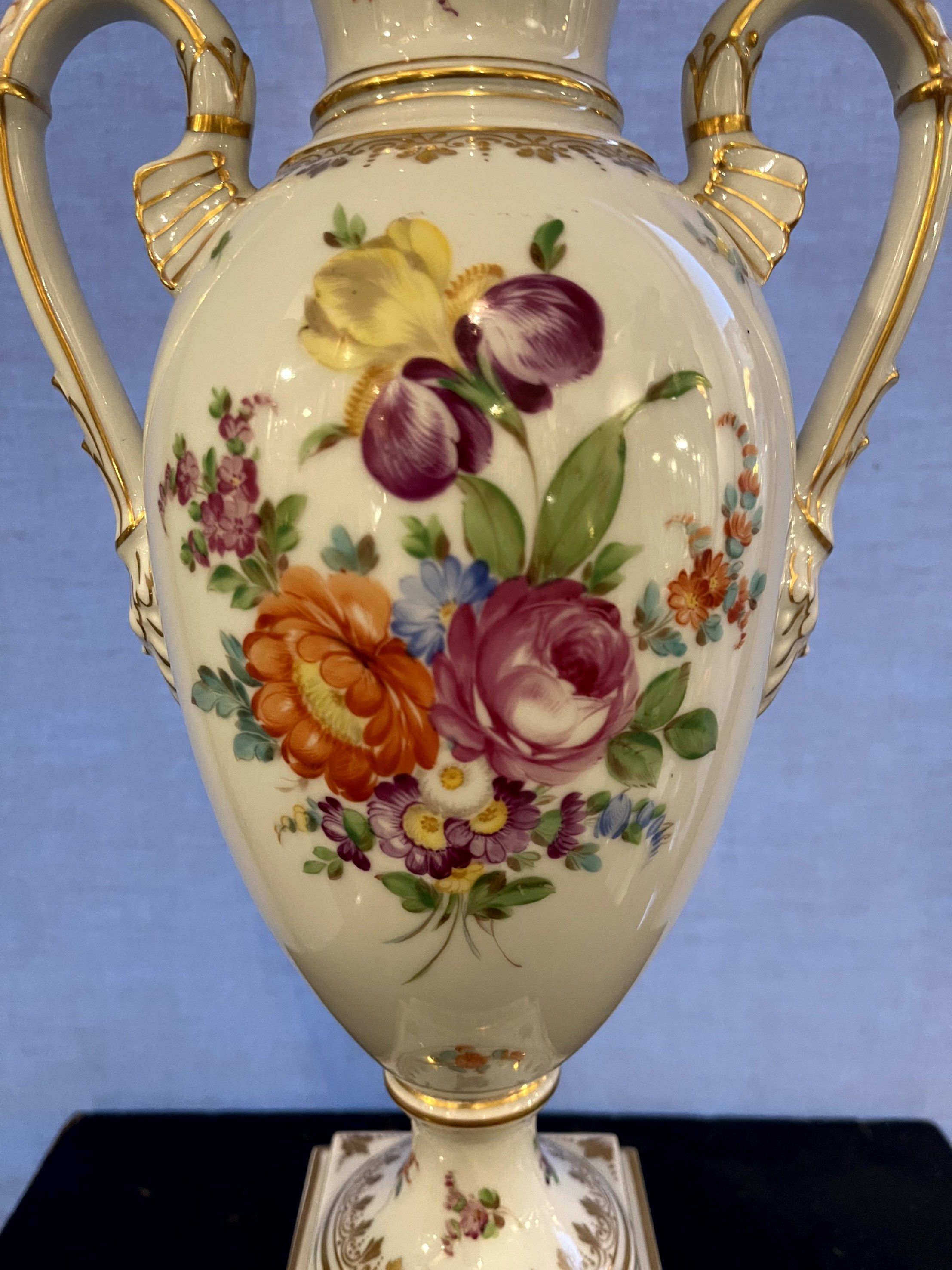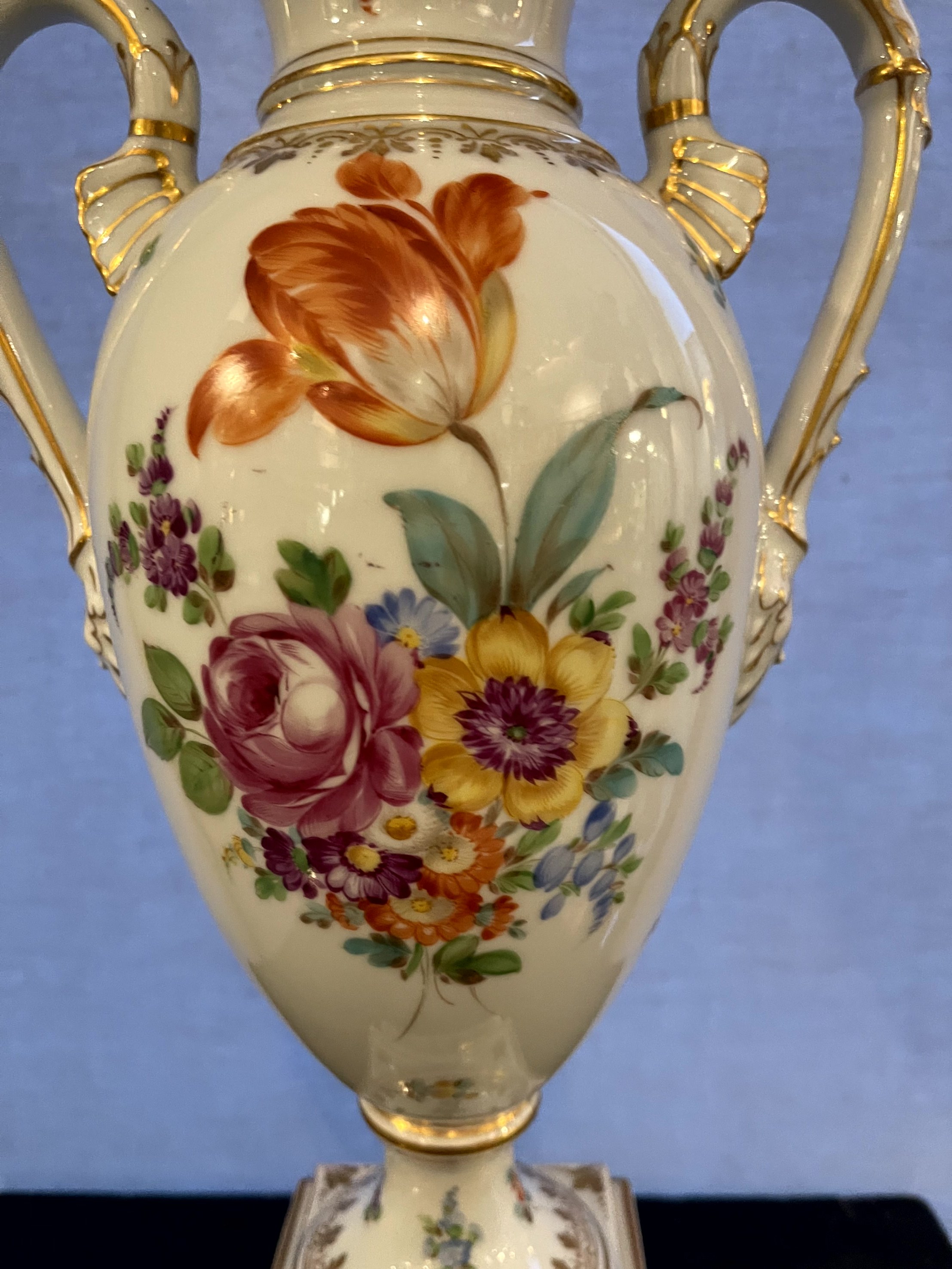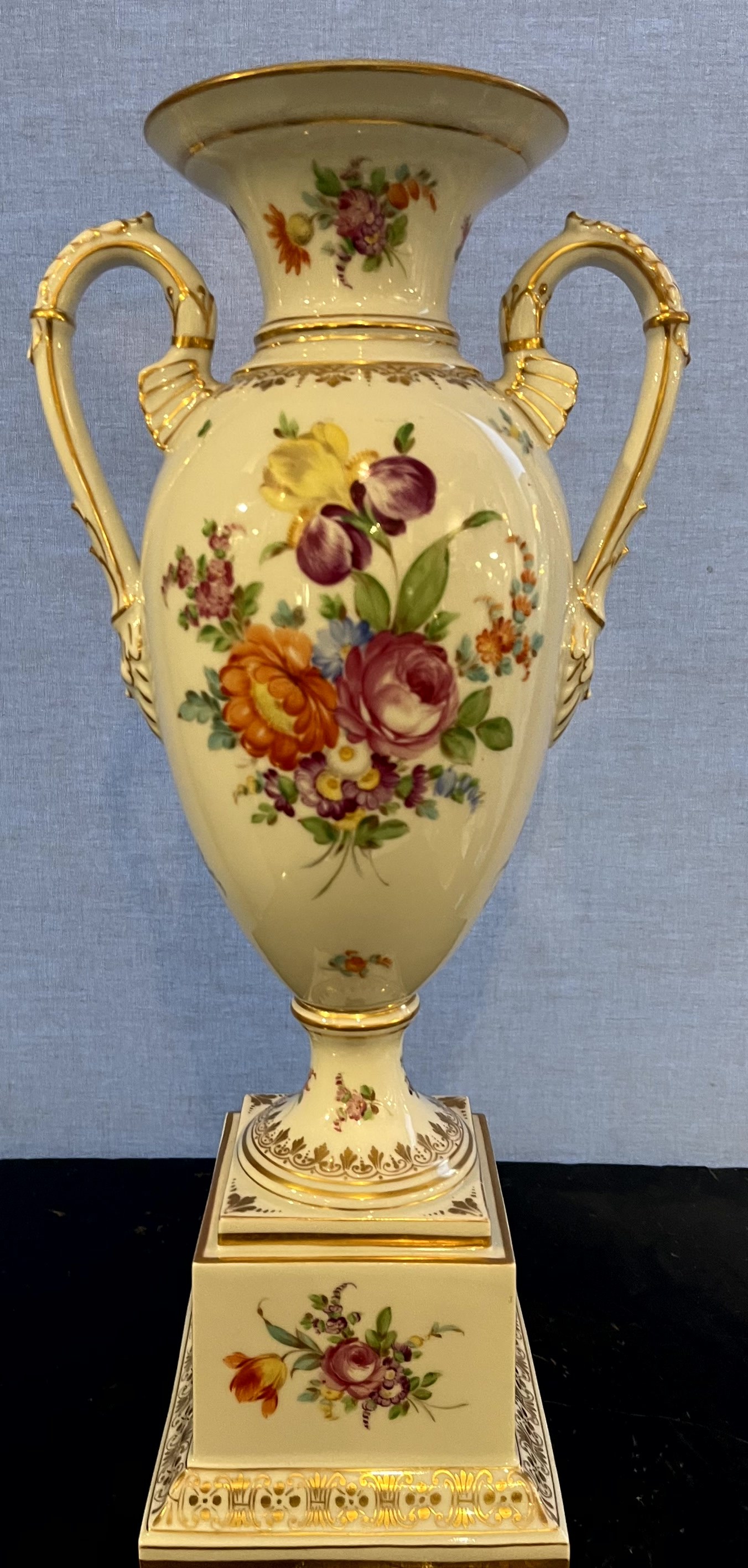 Efektowna dwuuszna waza w formie amfory na prostopadłościennej plincie, z okrągłą stopą, smukłym korpusem i rozszerzającym się wylewem. Dekorowana malowanymi bukietami kwiatów i rzutkami kwiatowymi, złocona, plastyczne uszy naczynia ze złoceniami. Wytwornia porcelany w Dreźnie, pocz. XX w. Stan zachowania - bardzo dobry.