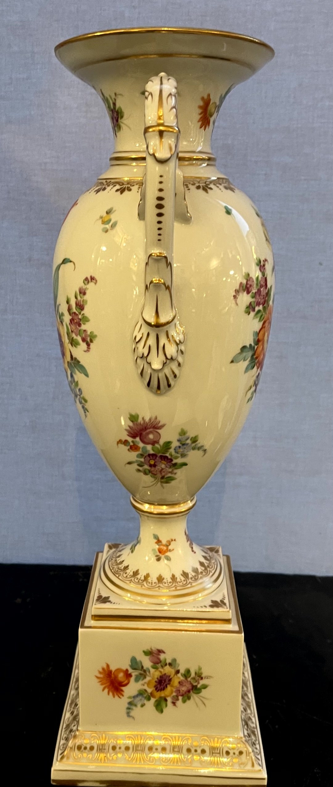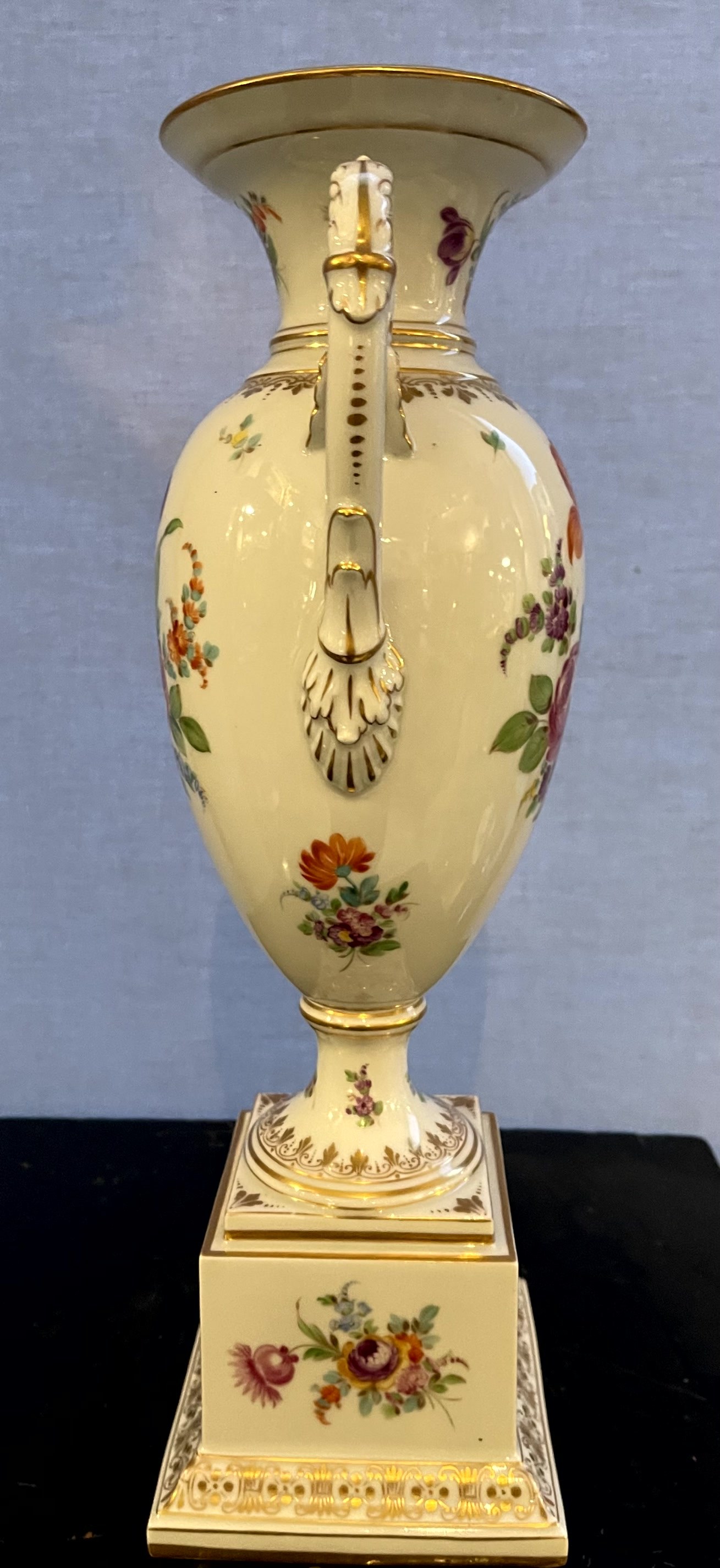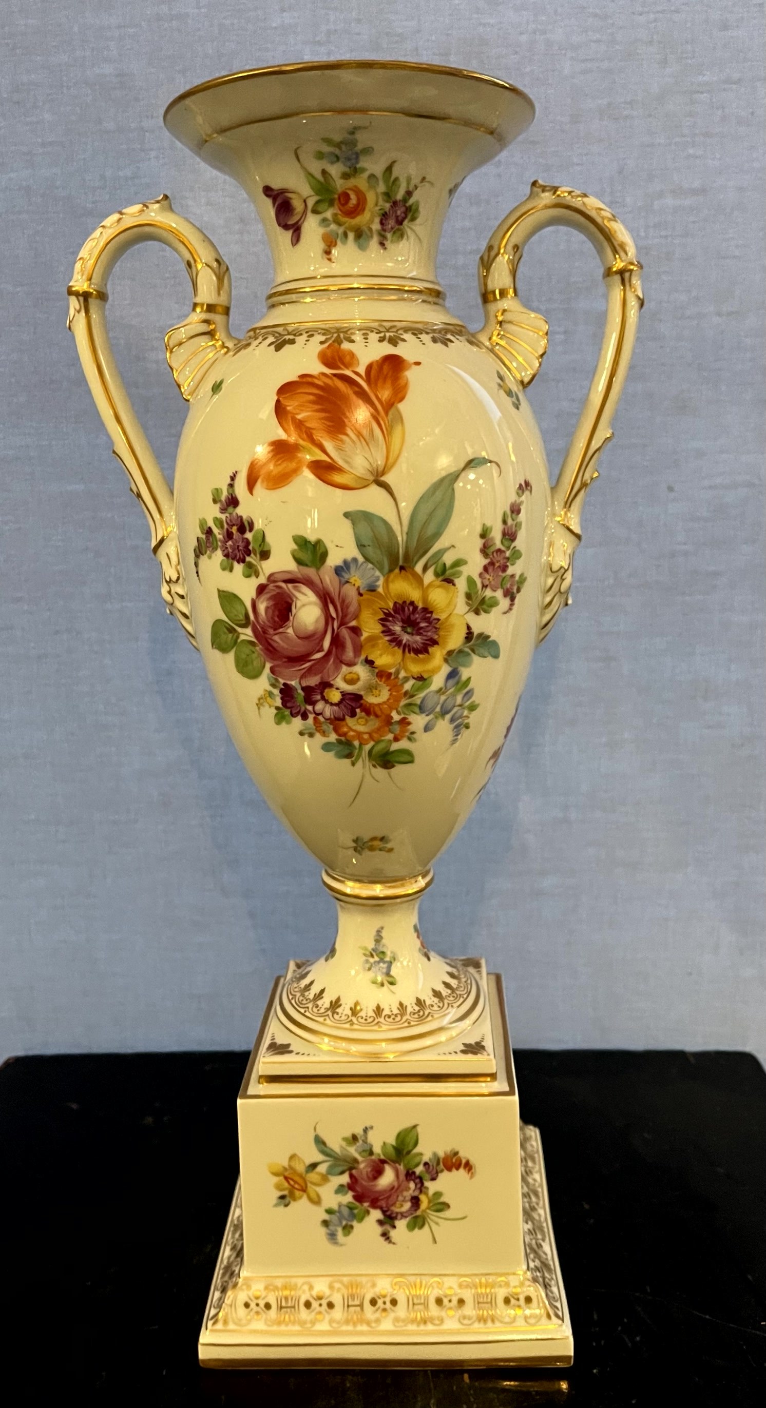 Efektowna dwuuszna waza w formie amfory na prostopadłościennej plincie, z okrągłą stopą, smukłym korpusem i rozszerzającym się wylewem. Dekorowana malowanymi bukietami kwiatów i rzutkami kwiatowymi, złocona, plastyczne uszy naczynia ze złoceniami. Wytwornia porcelany w Dreźnie, pocz. XX w. Stan zachowania - bardzo dobry.
