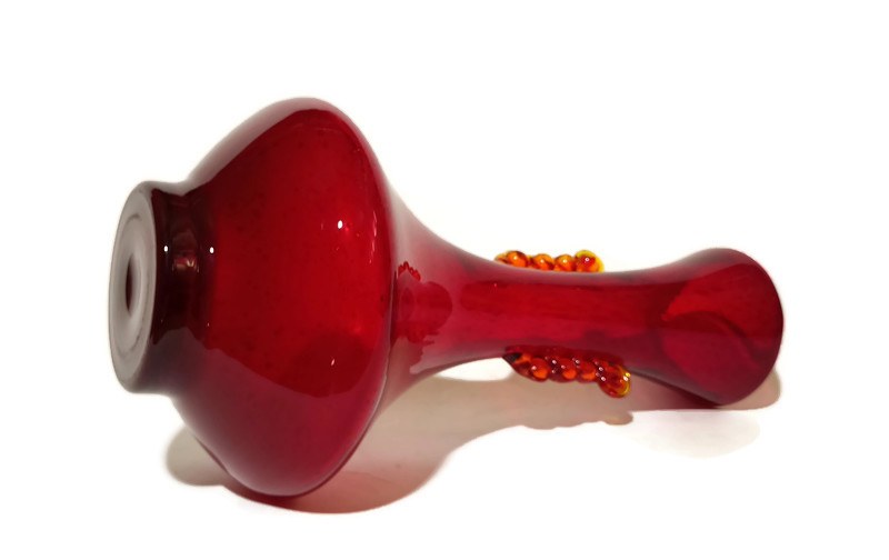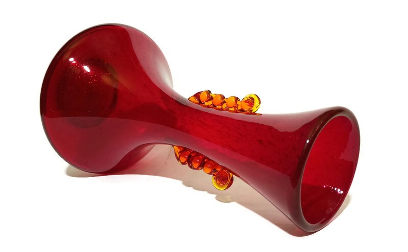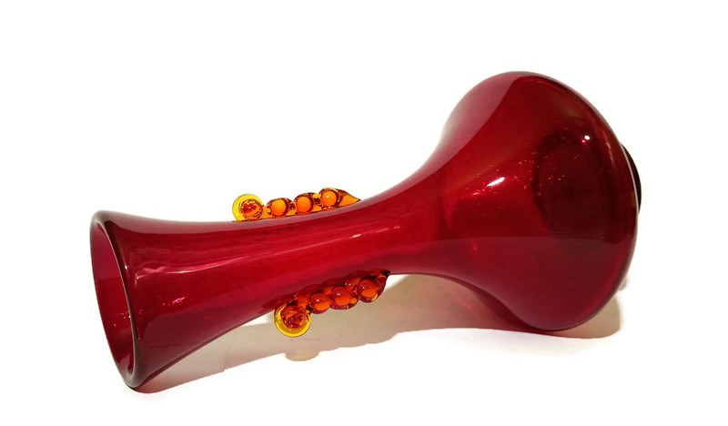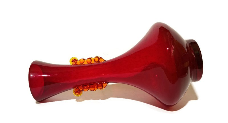 szkło sodowe, barwione w masie, formowane ręcznie, antico - mocne napowietrzenie szkła, aplikacje po obu stronach wlewu, wysokość 40cm (wyższa forma), stan bardzo dobry, małe rysy na podstawie