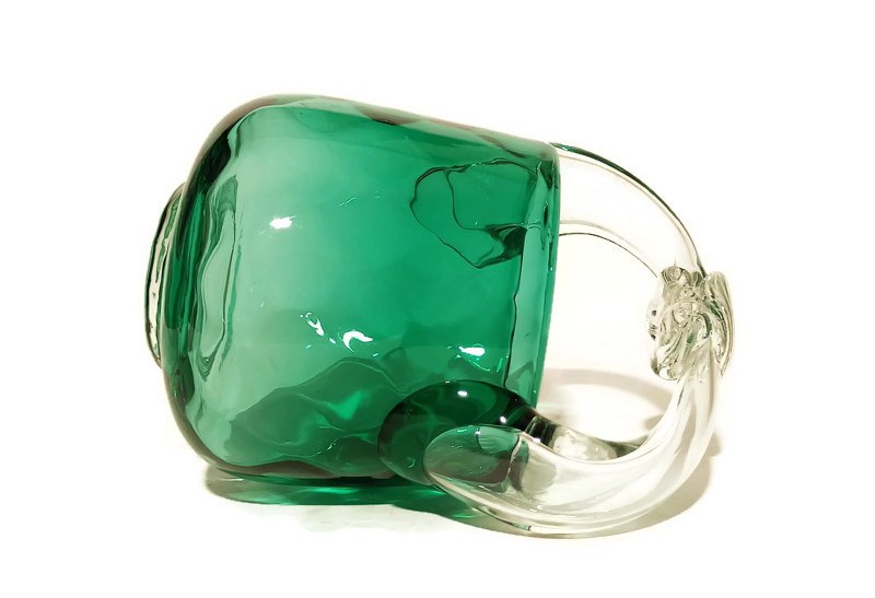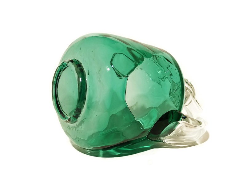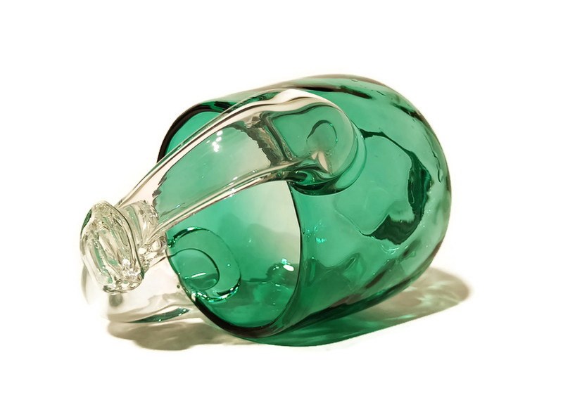 szkło sodowe, brzusiec barwiony w masie, kanelowany, uchwyt z ozdobnikiem bezbarwny, wysokość 18cm, średnica 15cm