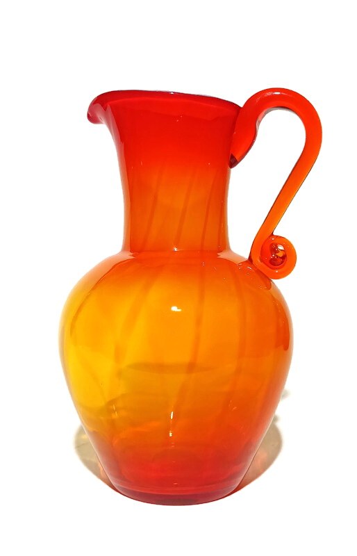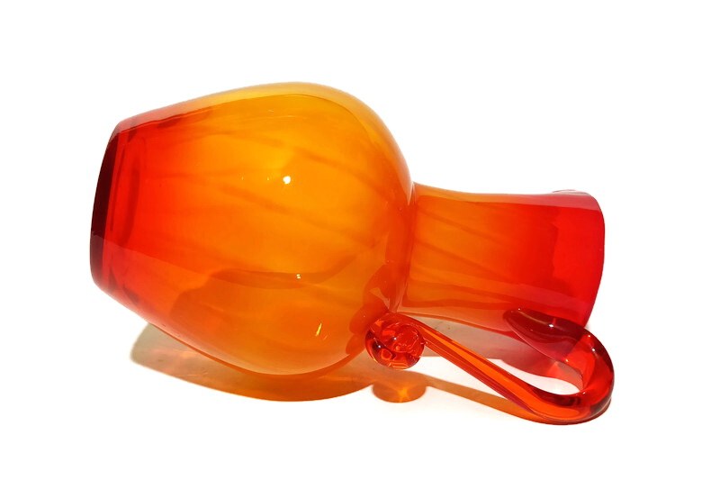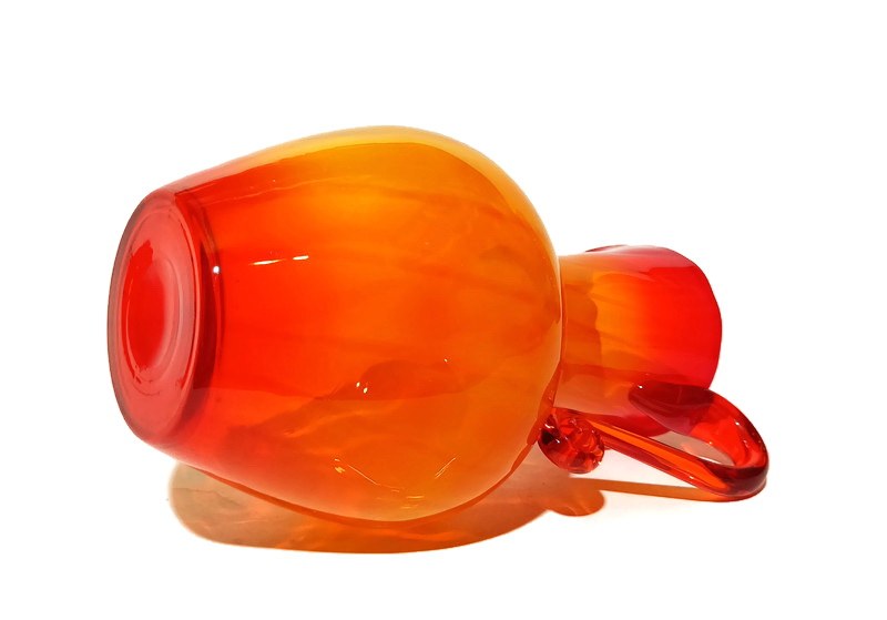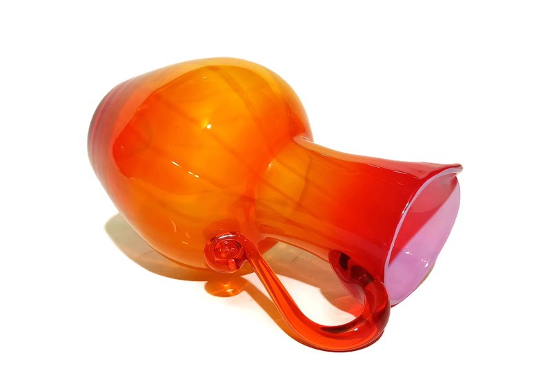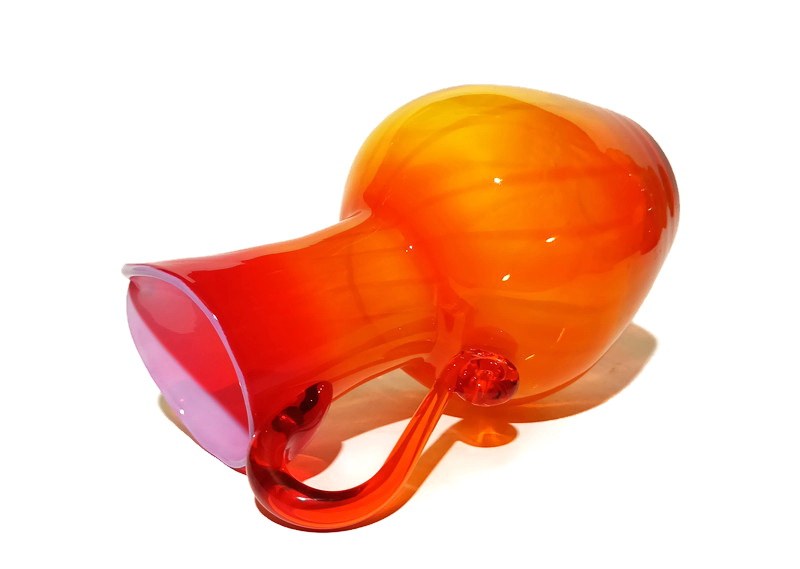 szkło sodowe, barwione w masie, kolor tonowany, wlew transparenty, mleczny, ozdobne kolorowe ucho zakończone ślimakiem, wysokość 22cm