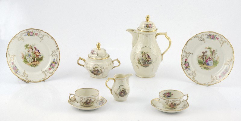 Zespół składa się z dzbanka z pokrywką, cukiernicy z pokrywką, mlecznika, 6 filiżanek małych do kawy ze spodkami i 6 talerzyków deserowych; razem: 21 naczyń. Model Sanssouci produkowano od lat 90. XIX wieku, z wieloma odmianami dekoracji barwnych; motyw ze scenkami dworskimi był popularny w latach 30./40 XX wieku.