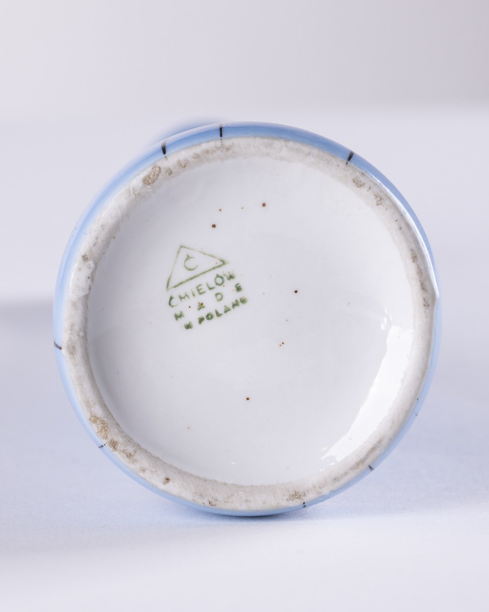 porcelana szkliwiona, natrysk, złocenia, wys. 23 cm, śr. wlewu 4 cm, śr. podstawy 6 cm, sygn. na spodzie pieczęcią wytwórni: "Ć" ĆMIELÓW MADE IN POLAND