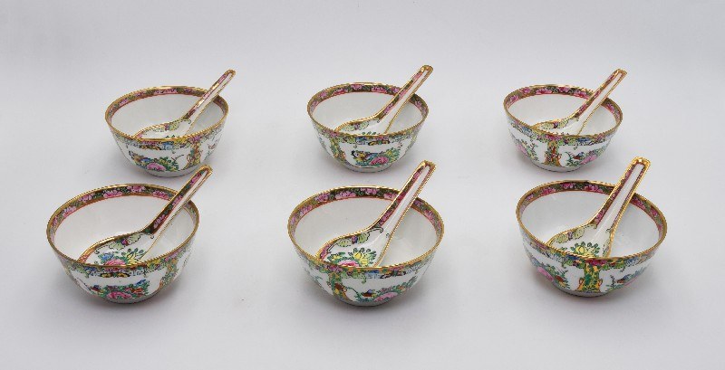 porcelana, farby naszkliwne, złocenie; miseczki 6 x 11,7 x 11,7 cm, łyżki o dług. 13,3 cm;