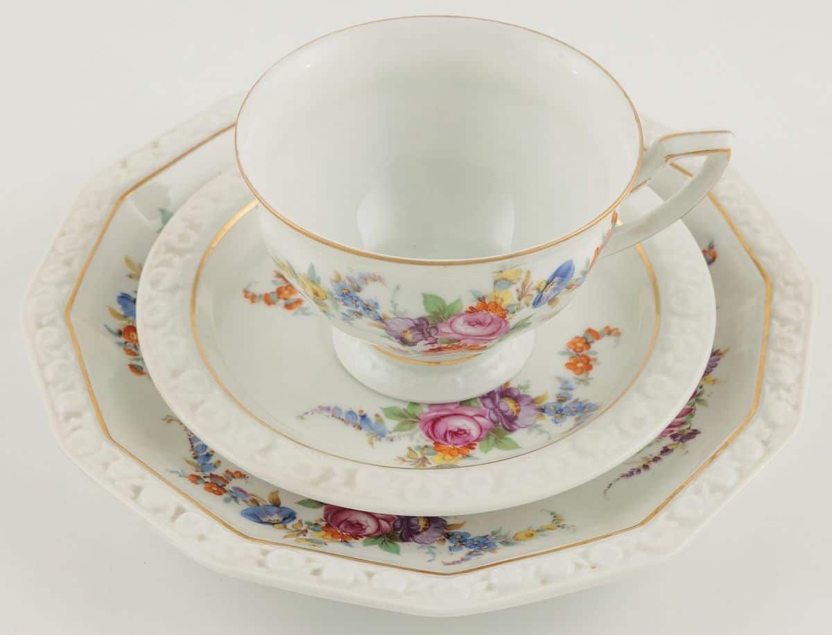 Porcelana, nadruk barwny, złocenie; wys. filiżanki 6,5 cm, śr. spodka 14 cm, talerzyka 19 cm
