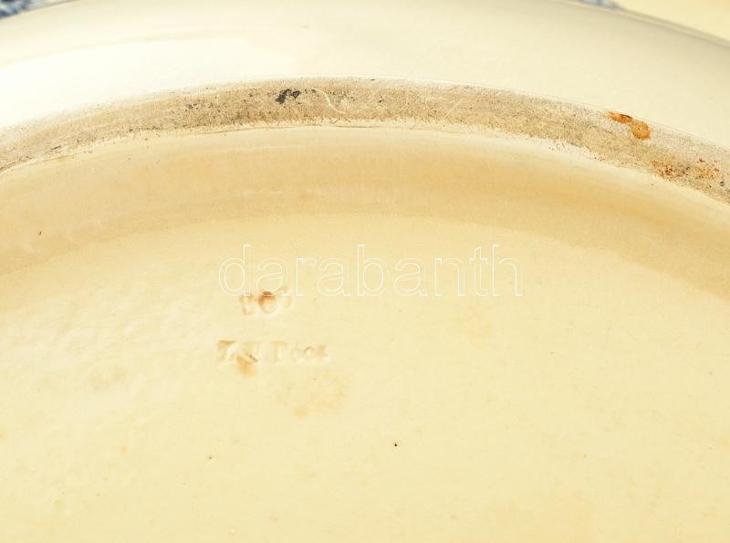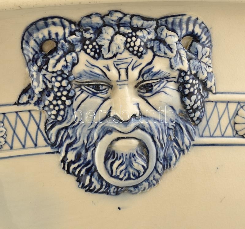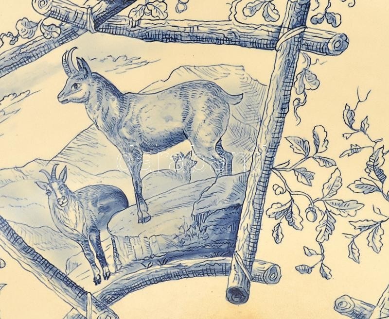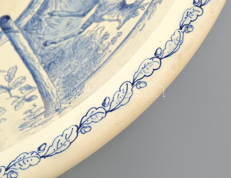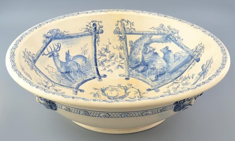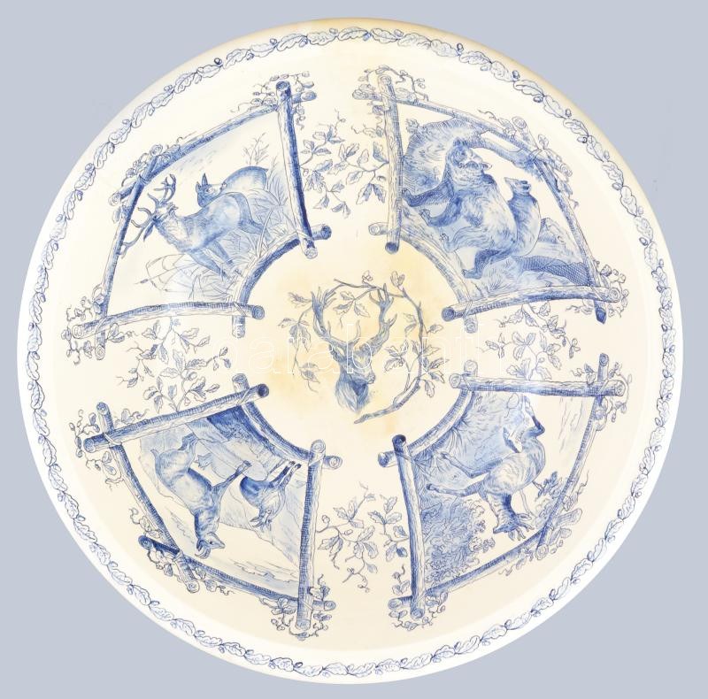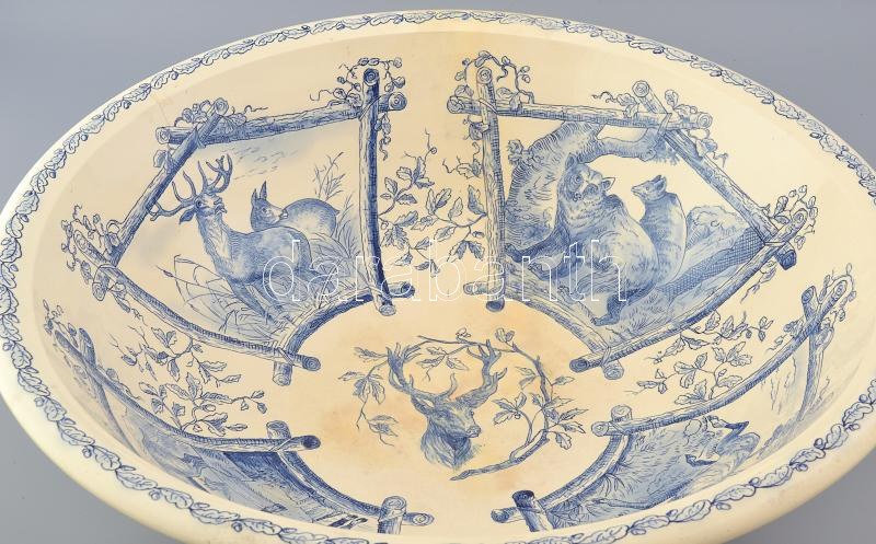 Zsolnay vadászos, nagy méretű mosdótál, 1900 körül, öblében szarvas, medve és muflon motívumokkal, palástján relief szerű fejekkel díszítve, máz alatti kékkel festett porcelán fajansz, jelzett, szépen restaurált, d: 57 cm (Feltehetően egyedi megrendelésre készült, gyűjtői darab!)