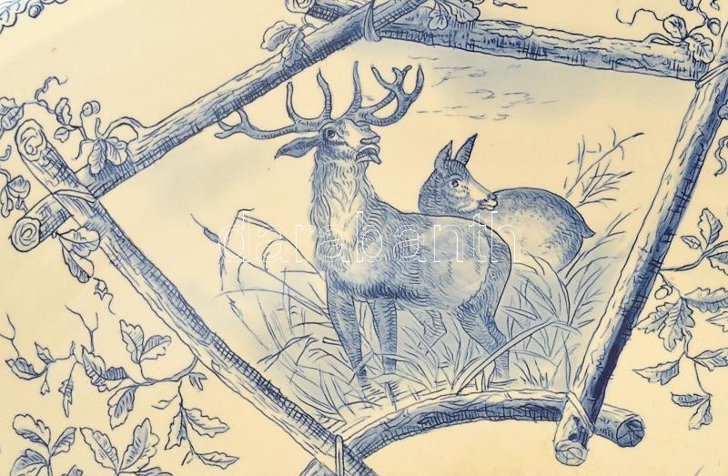 Zsolnay vadászos, nagy méretű mosdótál, 1900 körül, öblében szarvas, medve és muflon motívumokkal...