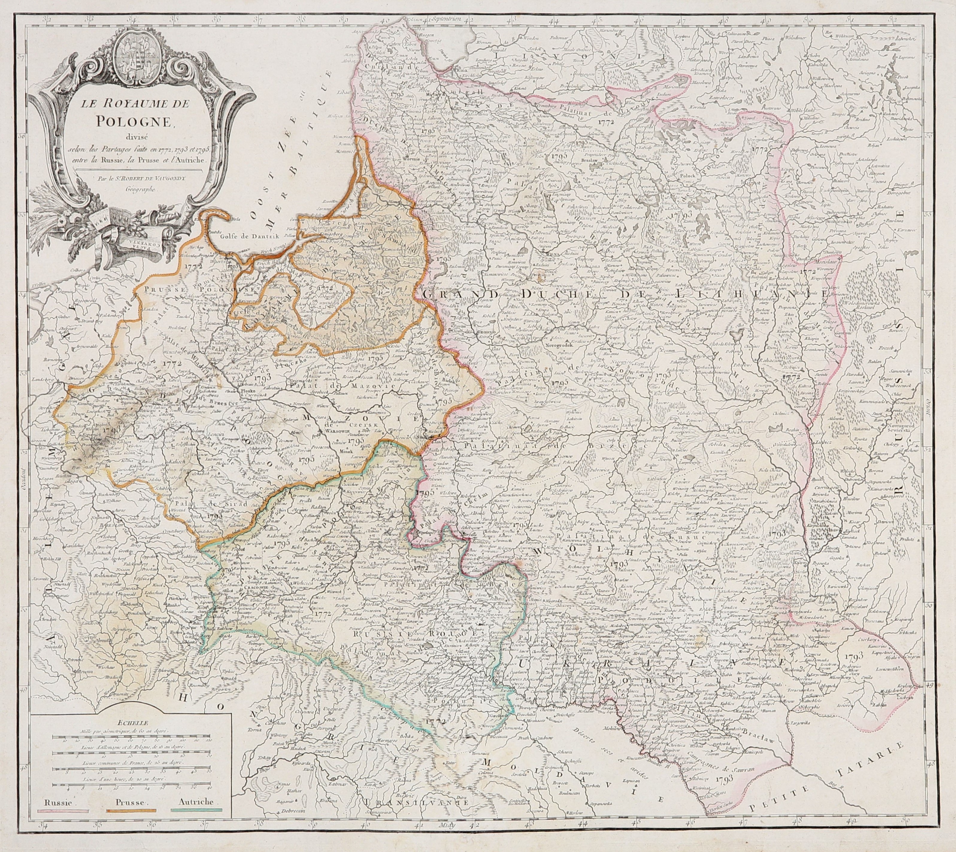 POLSKA (zwana w I RP KORONĄ), WIELKIE KSIĘSTWO LITEWSKIE. Mapa Rzeczpospolitej autorstwa D. Roberta de Vaugondy, pokazująca granice zaborów; stan trzeci, wyd. H. Langlois, po 1795; miedz. kolor., st. bdb., zabrudzenia, naddarcia; wym. płyty 565x500 mm; LE ROYAUME DE POLOGNE divisé selon les Partages [...]; [Imago Poloniae K47/4]; BARDZO RZADKA!