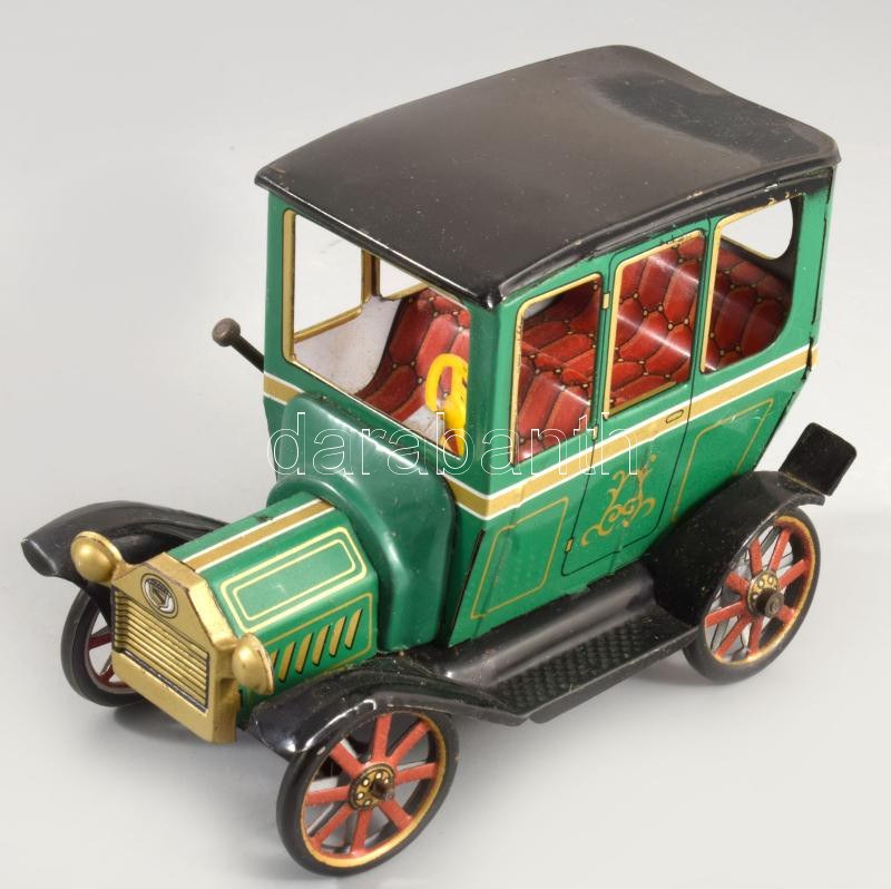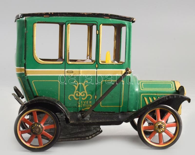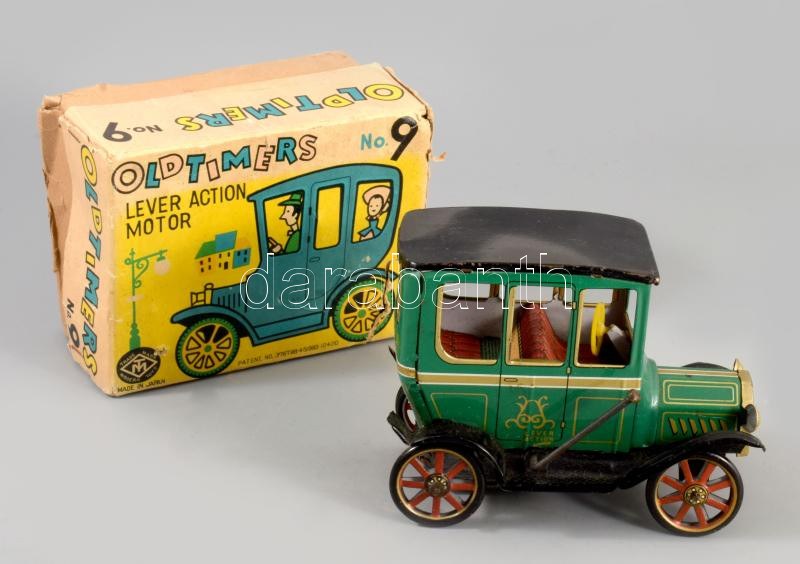 cca 1960/70 Oldtimers Lever Action Motor No.9 lemezjáték. Japán, fém, műanyag, eredeti, sérült dobozában, 14x10 cm /// c. 1960/70 Oldtimers Lever Action Motor No.9 tin toy. Japan, metal and plastic, in its original damaged box, 14x10 cm.