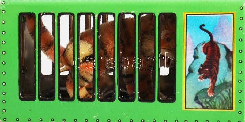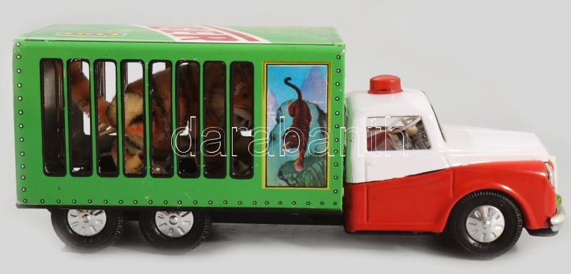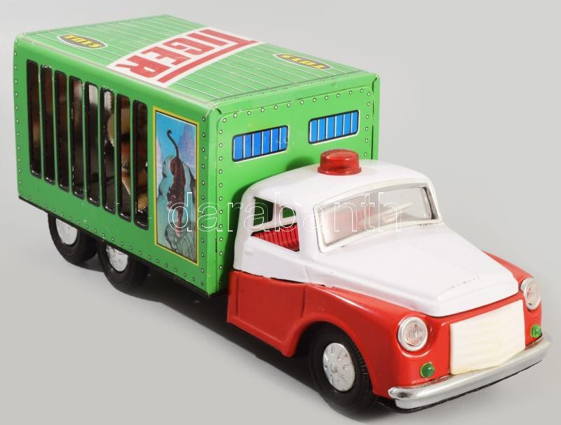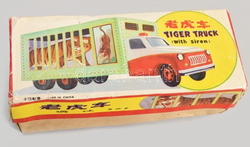 cca 1975 Metal Factory Tiger Truck MF 239 tigrisszállító cirkuszi autó lemezjáték. Kína, fémlemez, eredeti, kissé sérült dobozában, jó állapotban, lendkerekes, h: 25,5 cm /// c. 1975 Metal Factory Tiger Truck MF 239 Circus Tiger Transport Tin Toy. Made in China, tinplate construction, original box (slightly damaged), in good condition. Friction drive mechanism, length: 25.5 cm.
