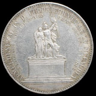 Srebro (Ag) Średnica: 40,5 mm Waga: 34,22 g MEDALE ZAGRANICZNE NIEMCY - BAWARIA MEDAL PAMIĄTKOWY 1892 r. Popiersie Luitpolda w lewo, napisy/Pomnik armii/napisy, na rancie napis: GOTT SEGNE BAYERN