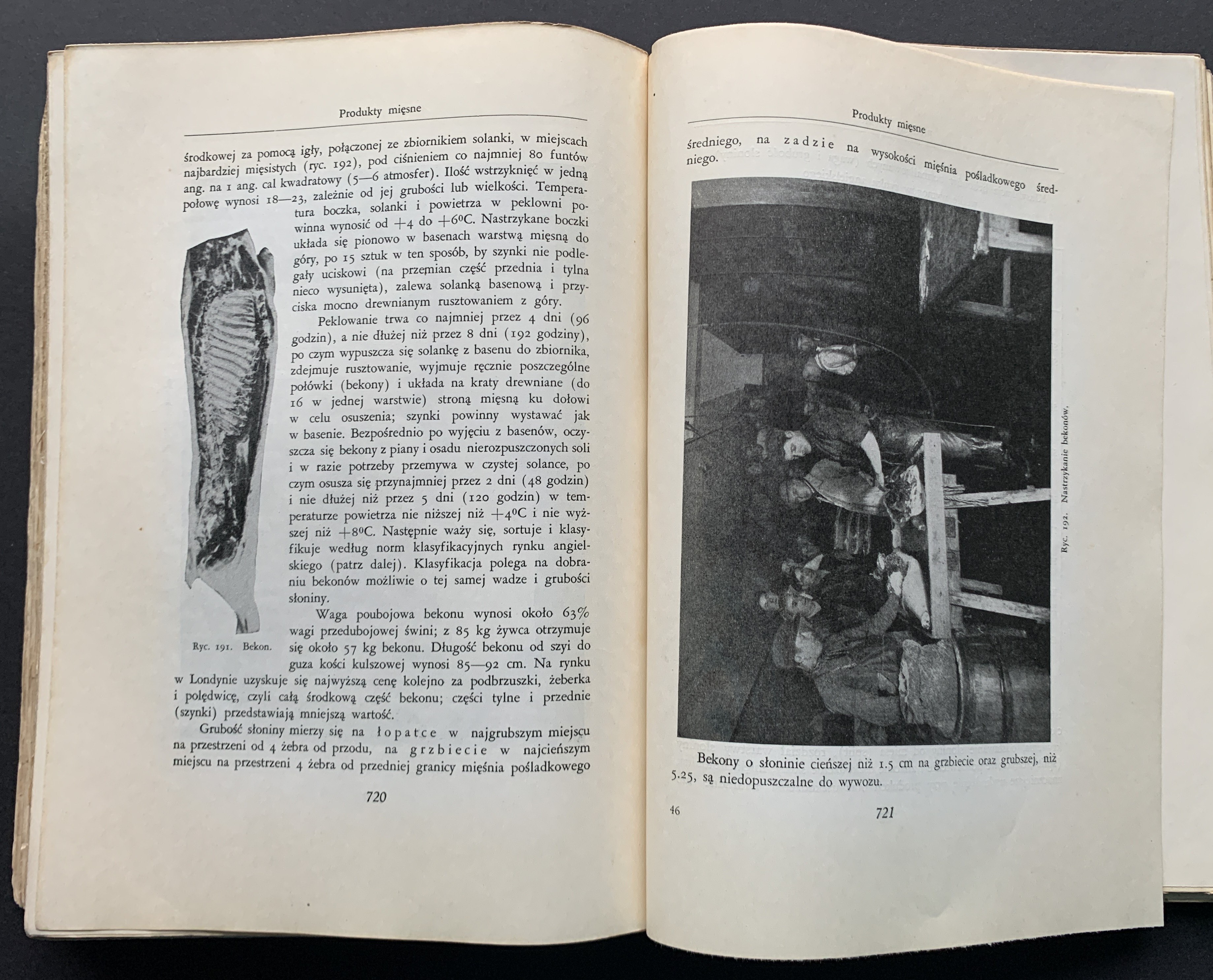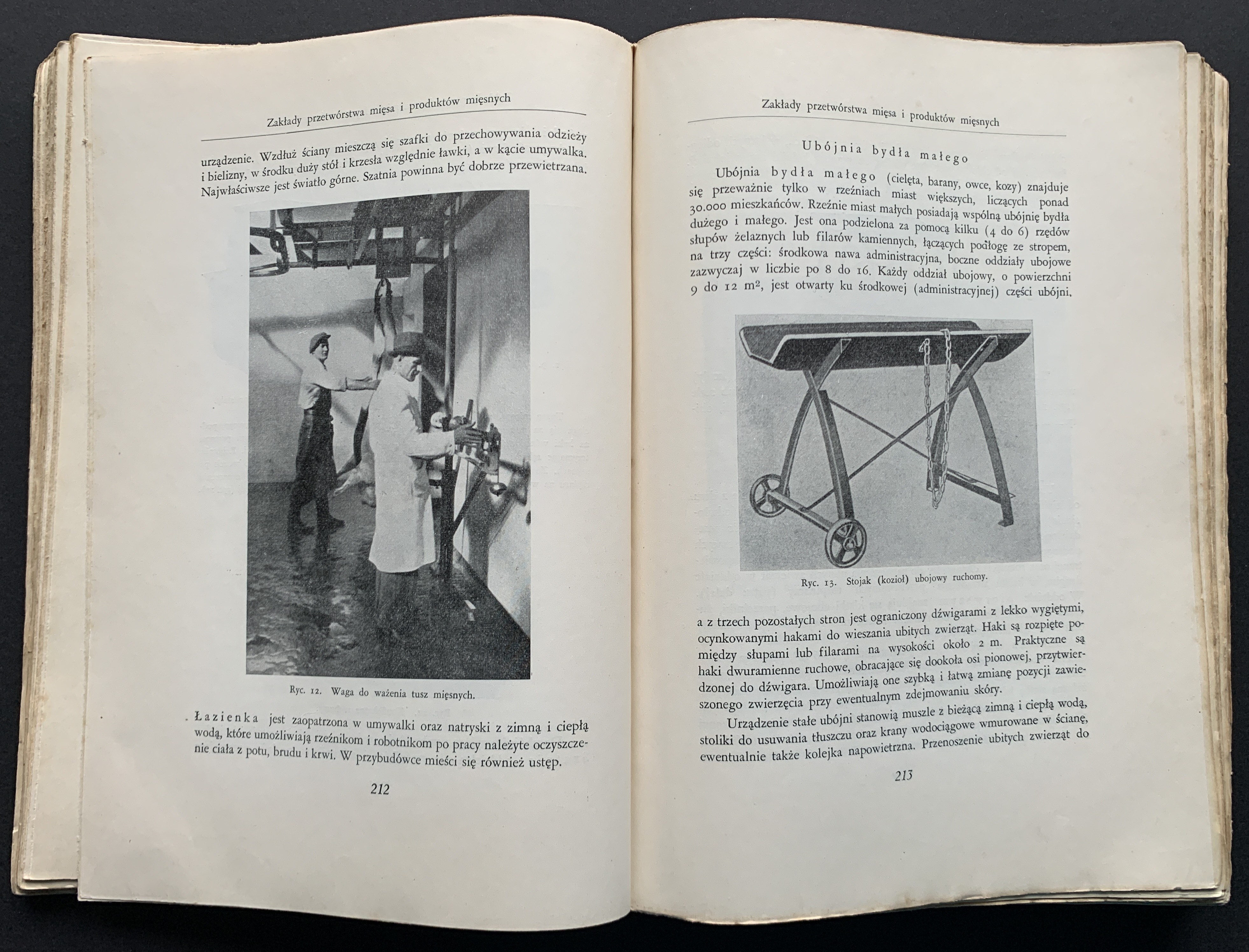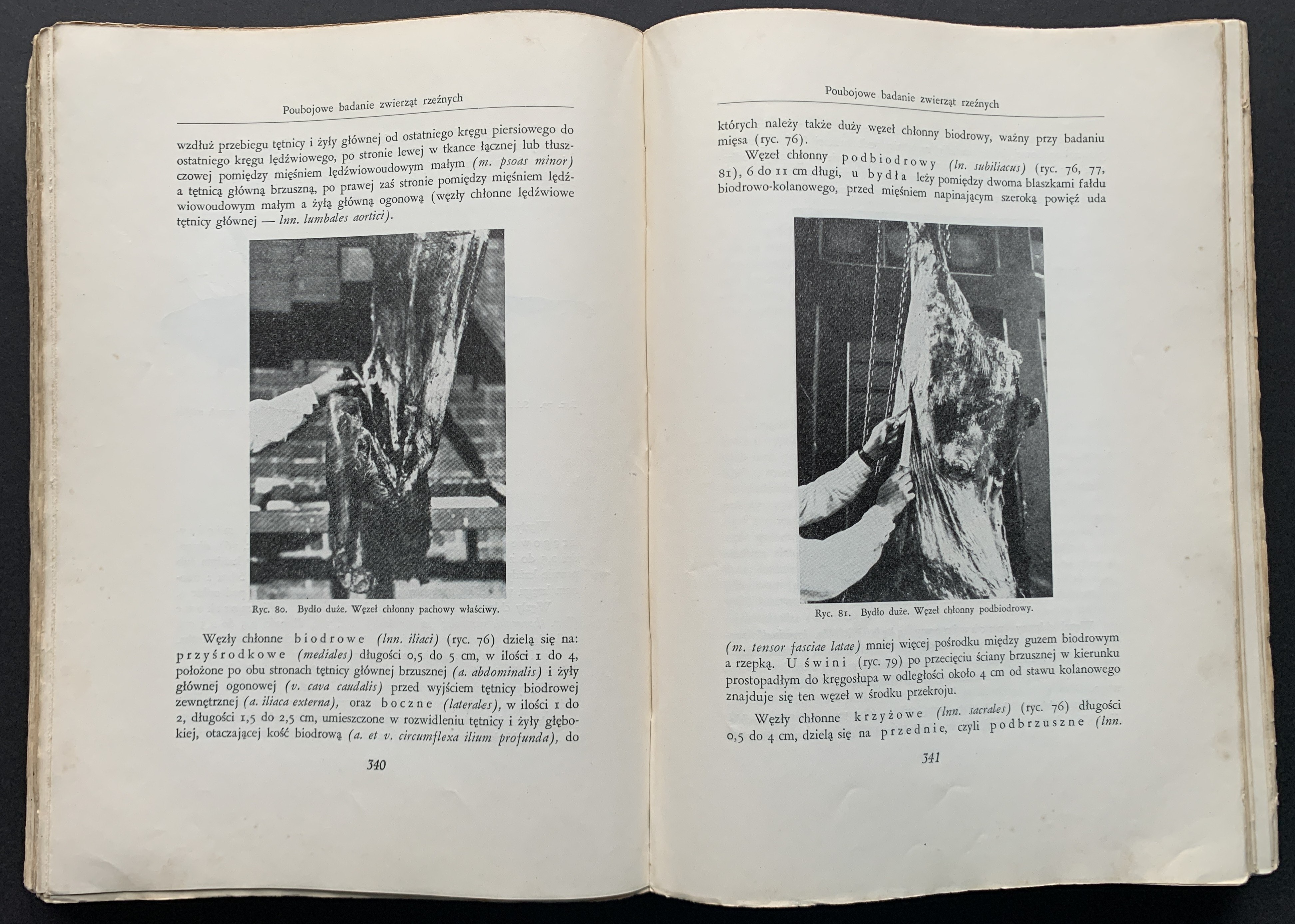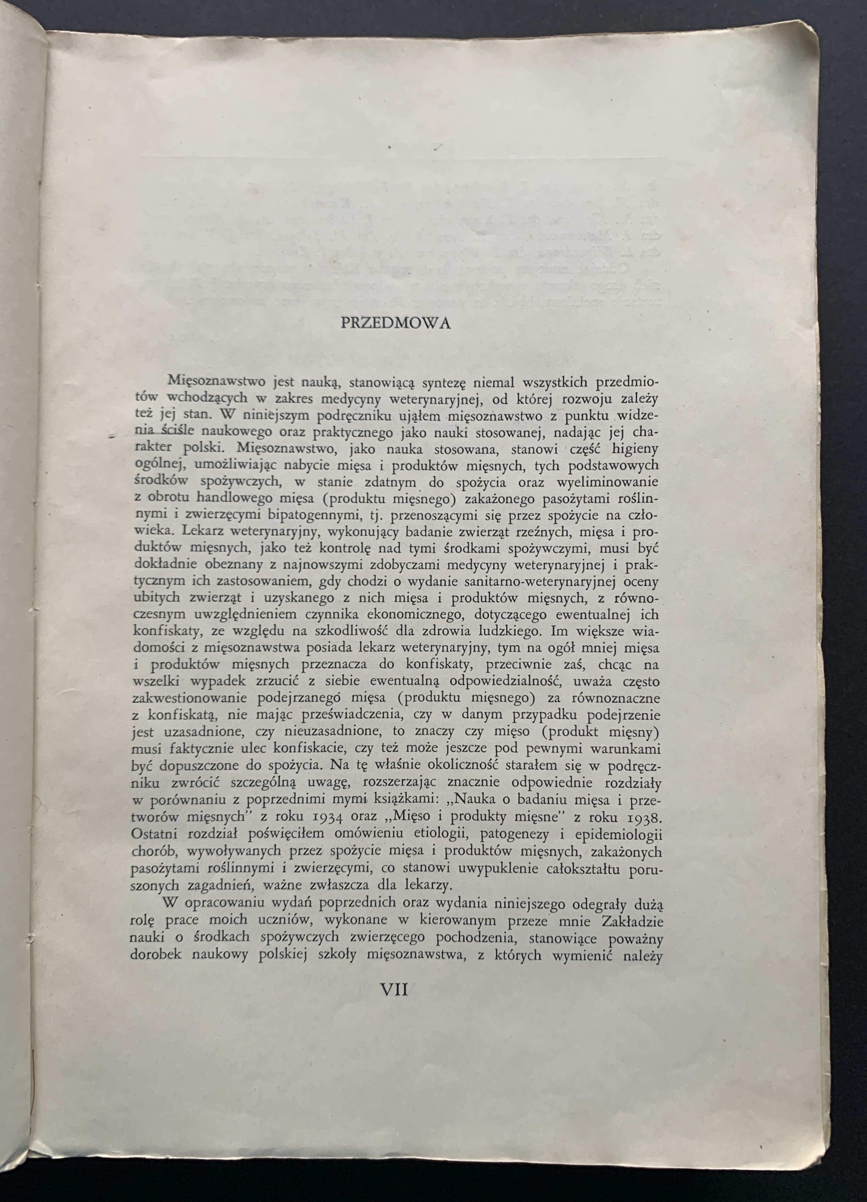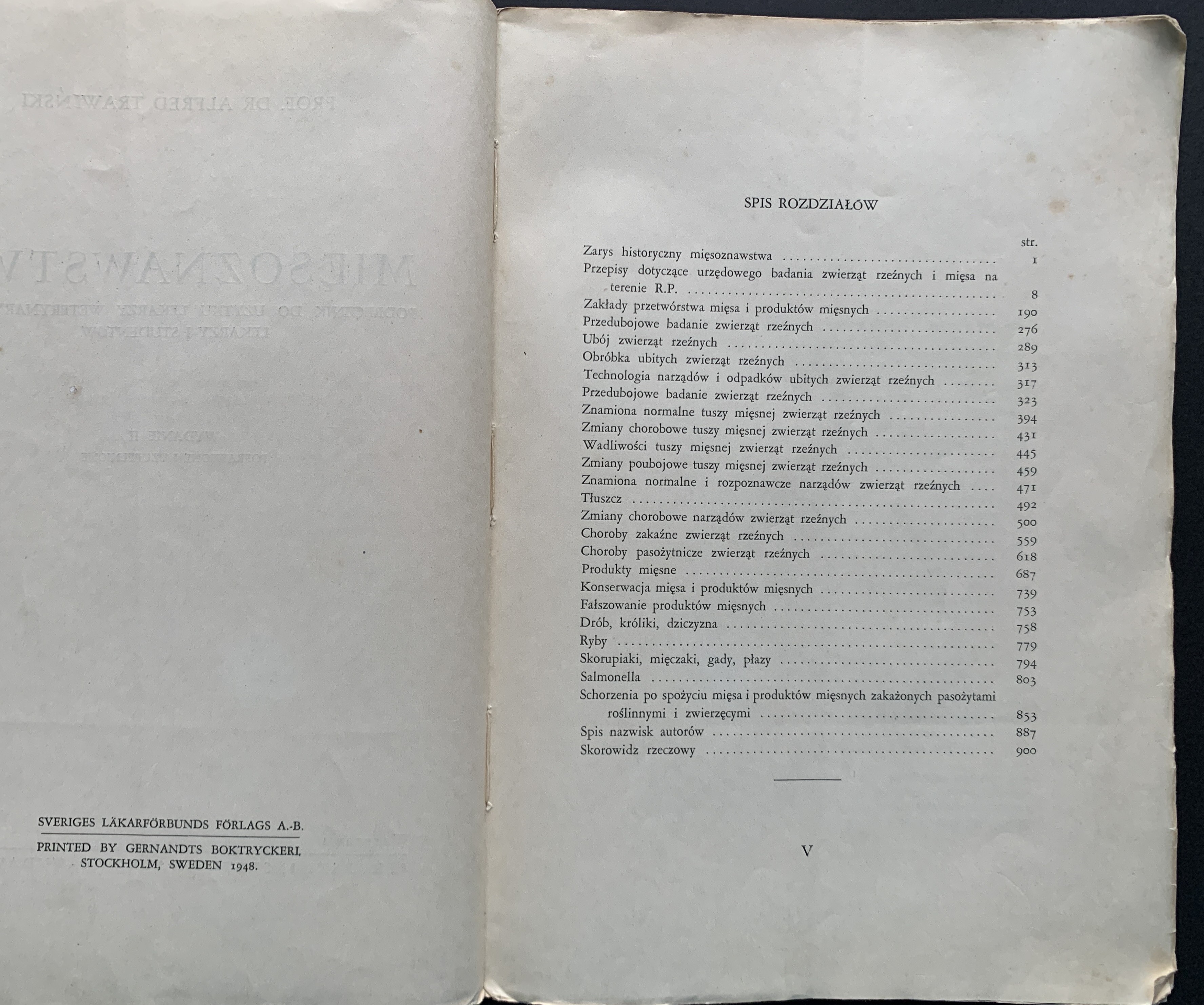 Obszerny PODRĘCZNIK, bogaty w ilustracje, zawierający rozdziały m.in.: Zarys historyczny mięsoznawstwa. Przepisy dotyczące urzędowego badania zwierząt rzeźnych i mięsa na terenie R.P. Ubój zwierząt rzeźnych. Choroby zakaźne zwierząt rzeźnych. Produkty mięsne. Konserwacja mięsa i produktów mięsnych. Drób, króliki, dziczyzna. Skorupiaki, mięczaki, gady, płazy. Salmonella. Schorzenia po spożyciu mięsa i produktów mięsnych zakażonych pasożytami roślinnymi i zwierzęcymi.