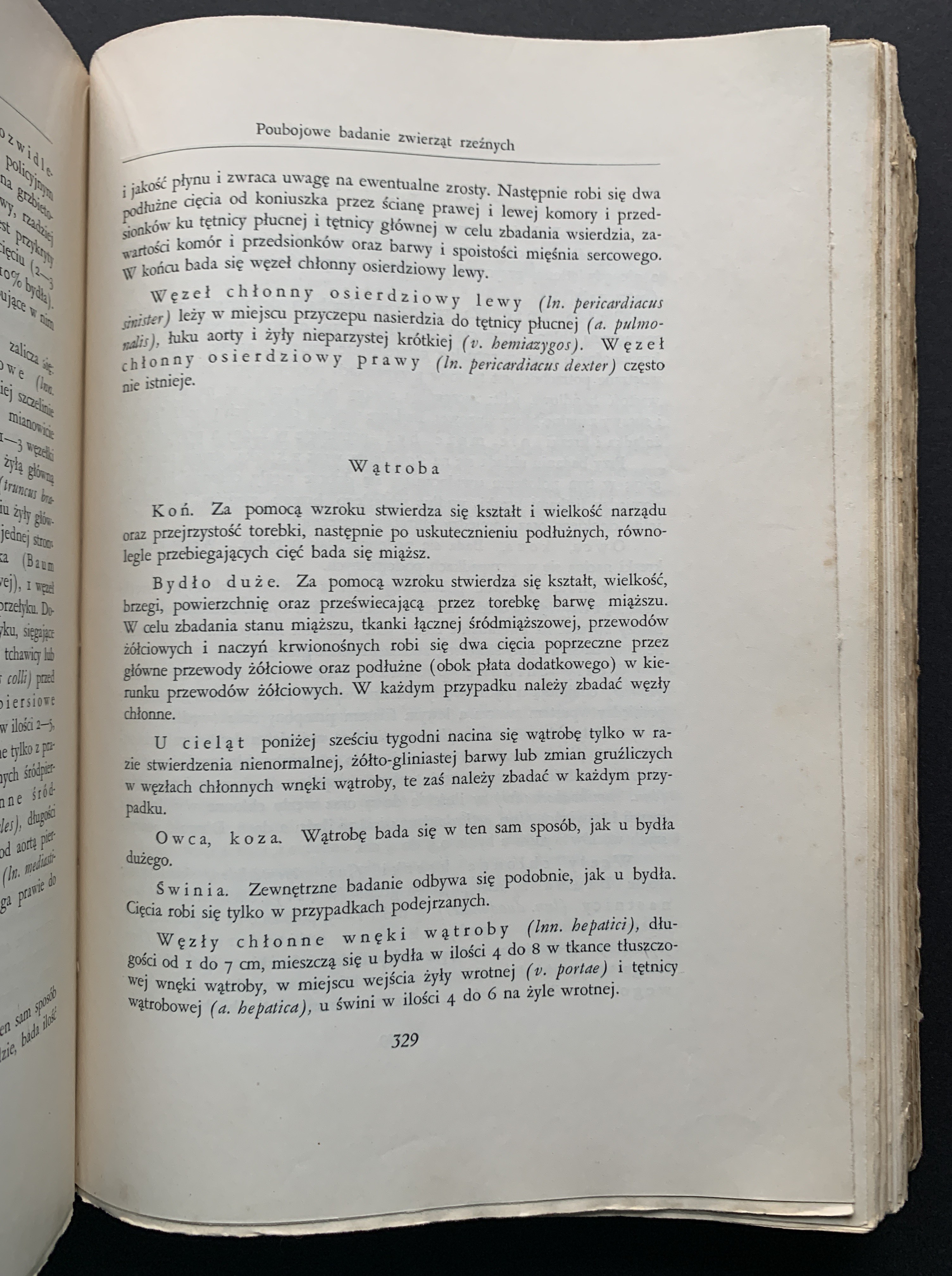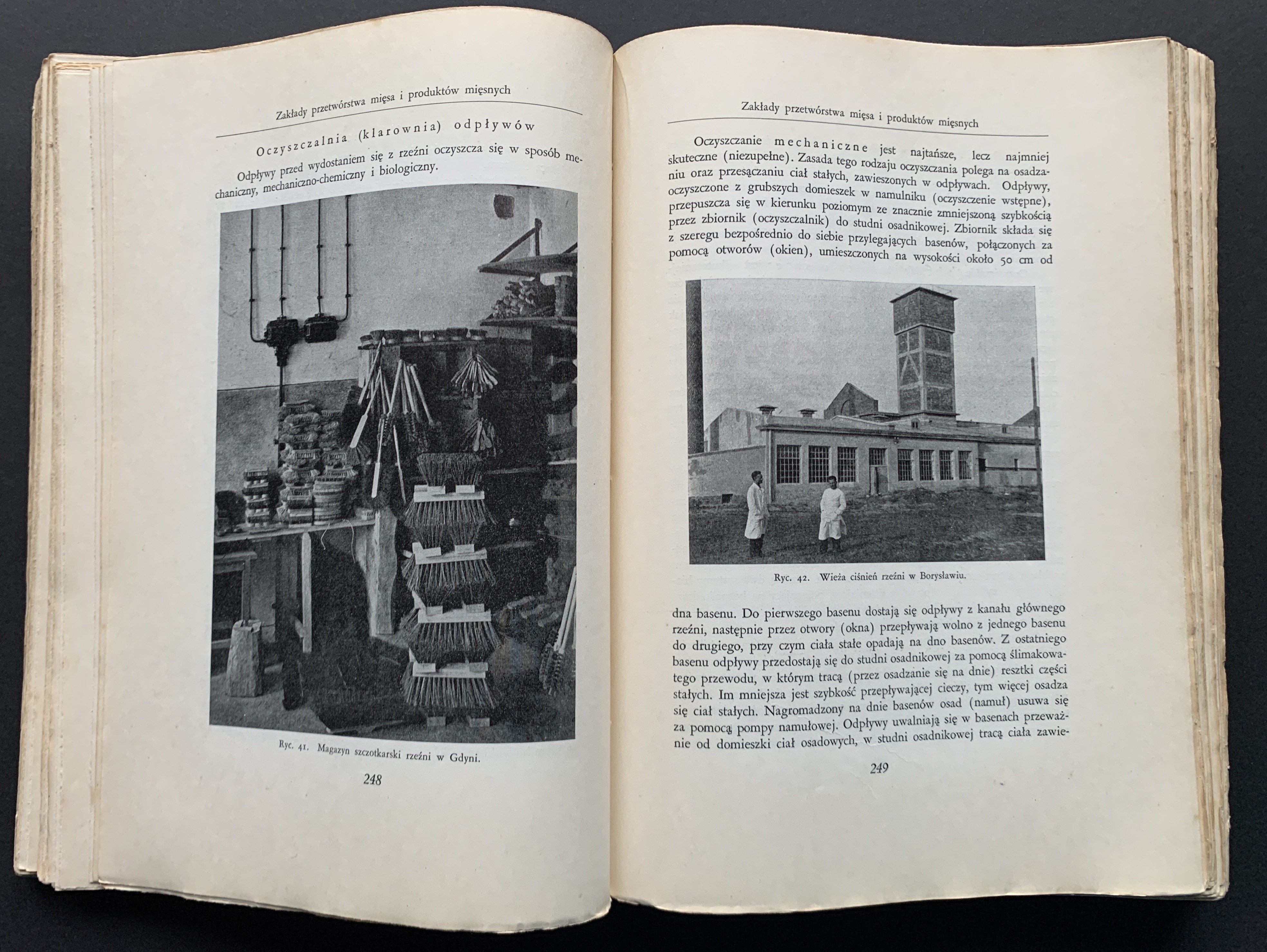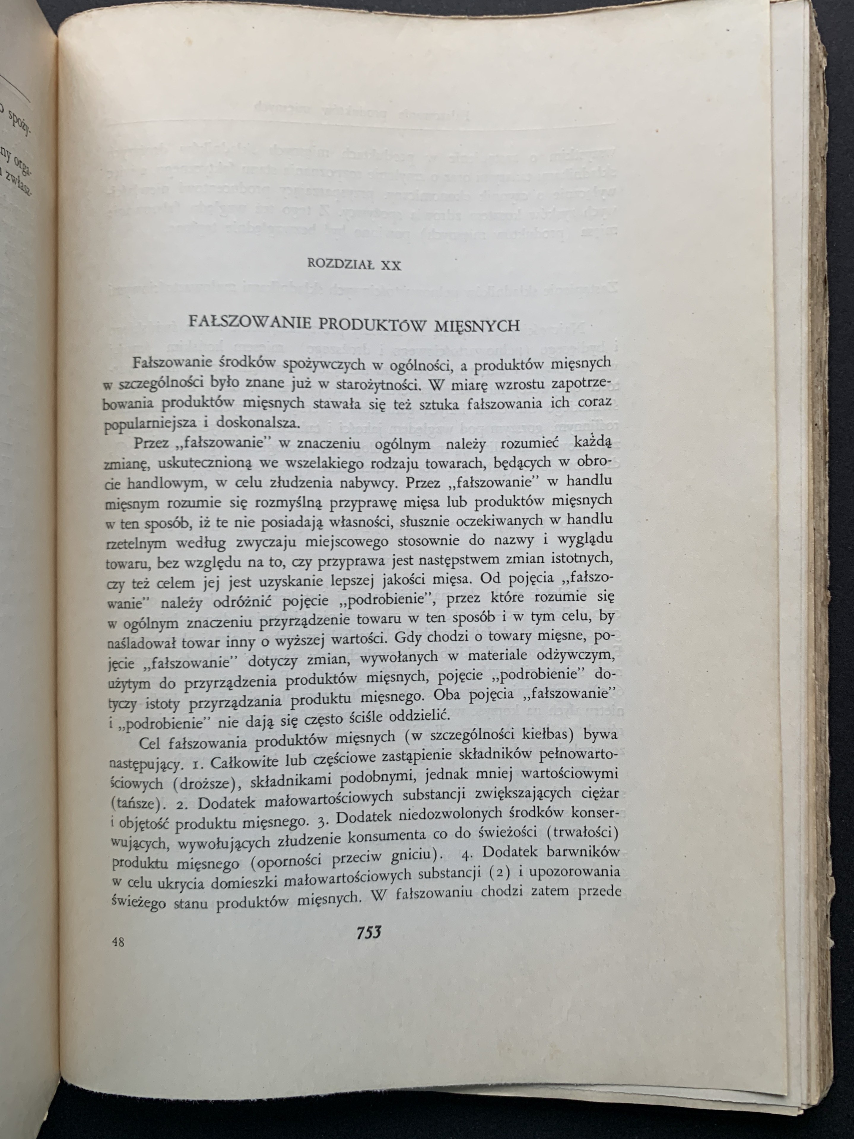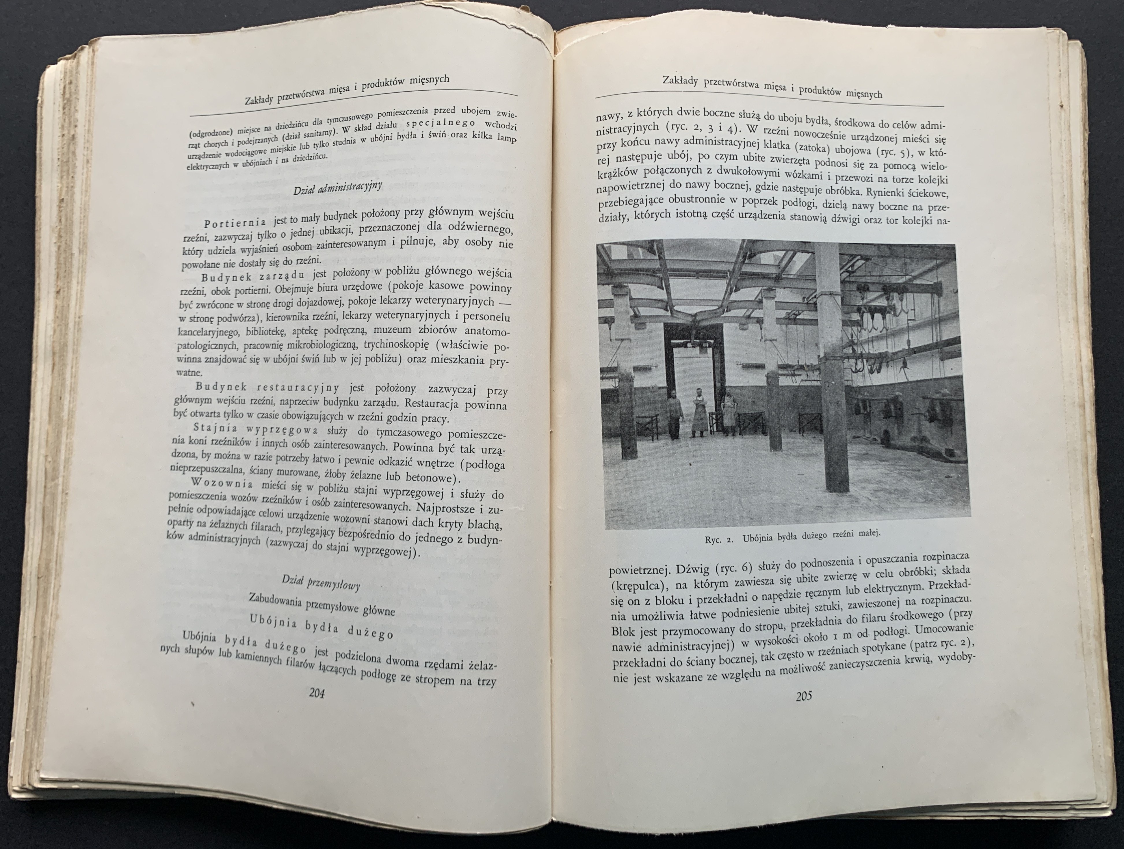 Obszerny PODRĘCZNIK, bogaty w ilustracje, zawierający rozdziały m.in.: Zarys historyczny mięsoznawstwa. Przepisy dotyczące urzędowego badania zwierząt rzeźnych i mięsa na terenie R.P. Ubój zwierząt rzeźnych. Choroby zakaźne zwierząt rzeźnych. Produkty mięsne. Konserwacja mięsa i produktów mięsnych. Drób, króliki, dziczyzna. Skorupiaki, mięczaki, gady, płazy. Salmonella. Schorzenia po spożyciu mięsa i produktów mięsnych zakażonych pasożytami roślinnymi i zwierzęcymi.