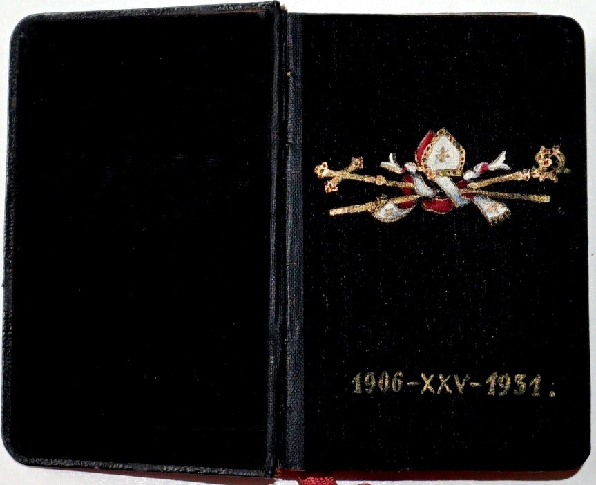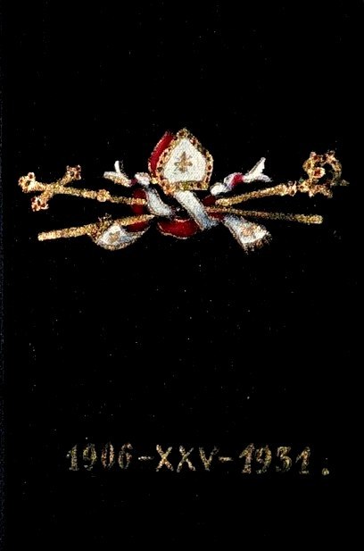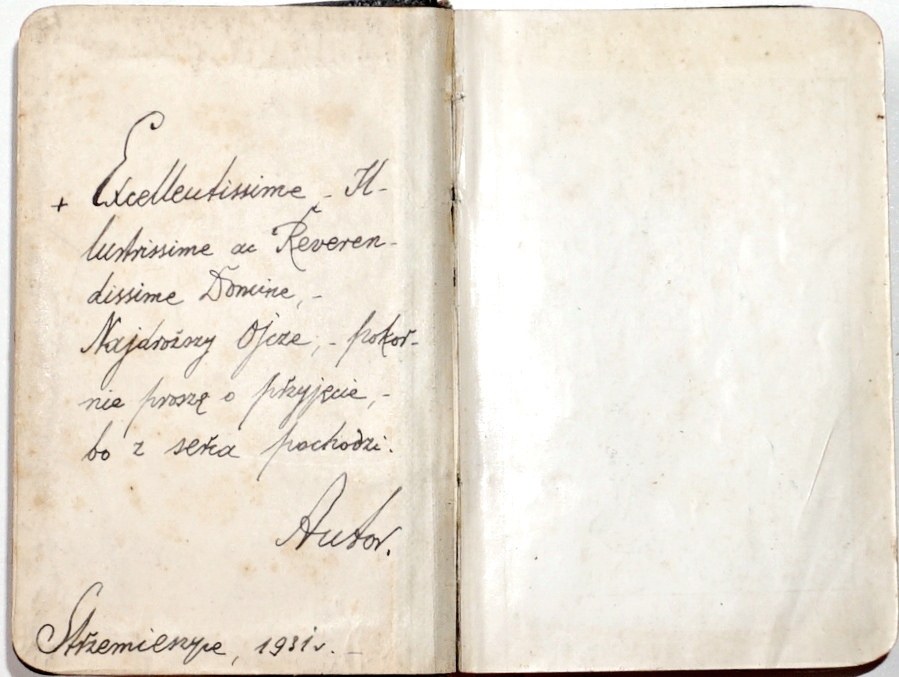 864 s., [1] k. tabl. : il., fot. ; półskórek z epoki z tłoczeniami i złoceniami, 13 cm; stan dobry, ładny i czysty egz., na wyklejce wpis autora „Excellentissime, Illustrissime ou Reverendissime Domine, Najdroższy Ojcze, pokornie proszę o przyjęcie, bo z serca pochodzi. Autor, Strzemieszyce, 1931 r.”; na wyklejce narysowana kolorem i złotem mitra ze skrzyżowanym krzyżem i pastorałem oraz napisem 1906 – XXV – 1931, co wskazuje na srebrny jubileusz, uwzględniając dedykację, jedyny biskup, który mógł obchodzić w Polsce taki jubileusz, to Władysław Bandurski (ur. 25 maja 1865, zm. 6 marca 1932) został konsekrowany na biskupa 30 grudnia 1906 roku.
