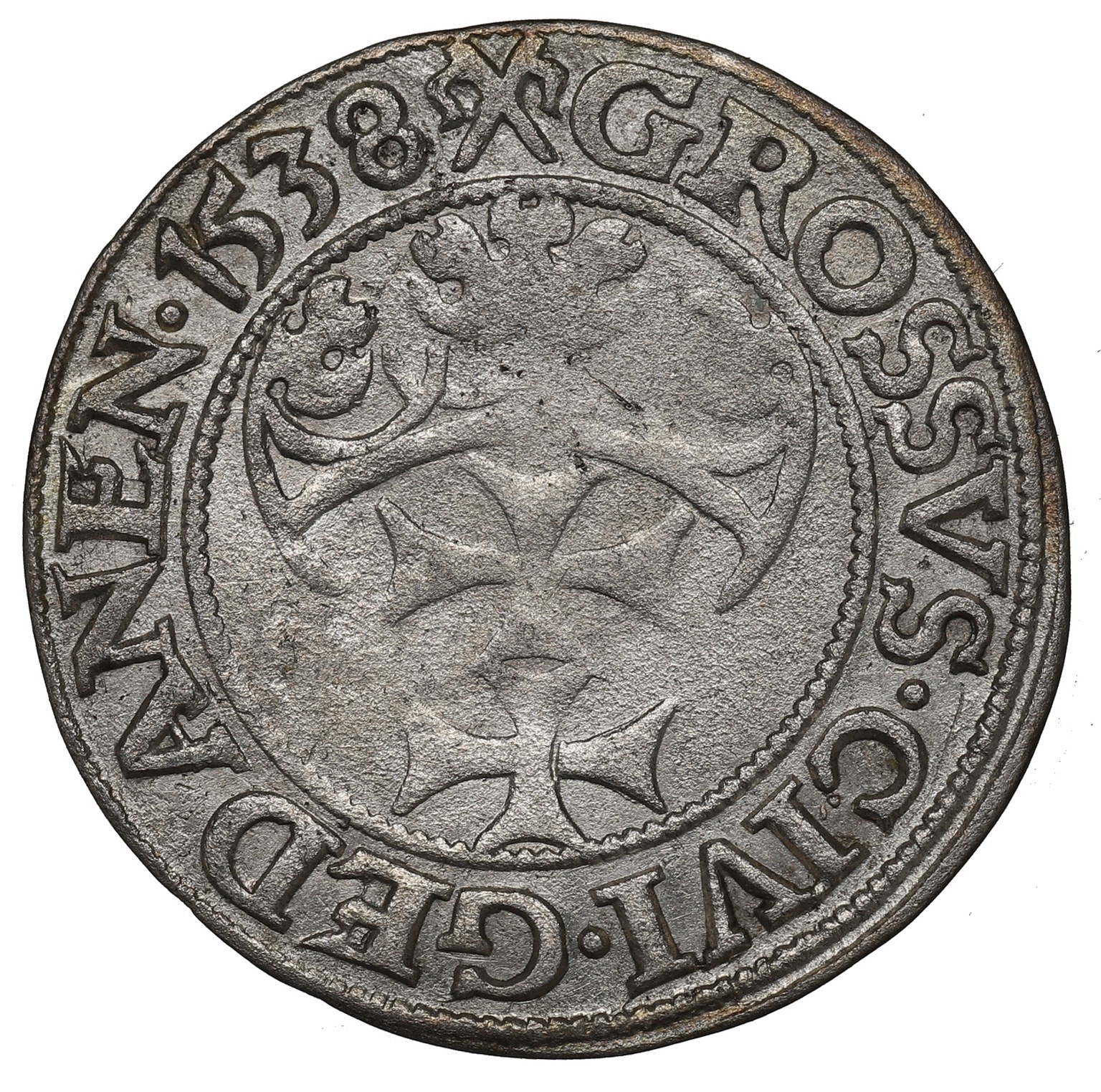 Awers: w otoku perełkowym ukoronowany herb Gdańska, w otoku zewnętrznym legenda rozpoczęta znakiem menniczym haki: