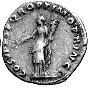 Denar, Aw. Popiersie Trajana w prawo, napis, Rw. Stojąca PAX z rogiem obfitości i laską Merkurego w lewo, napis COS V PPSPOR OPTIMO PRINC, Sear 3124, RIC 121, w. 3,01 g, Æ 18 mm