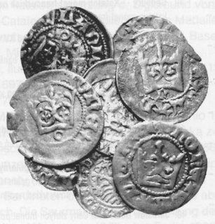 Półgrosze O (2 szt.), h, bez znaku, F i podwójny krzyż oraz Kazimierza Jagiellończyka 2 szt., i Aleksandra, razem 8 szt.