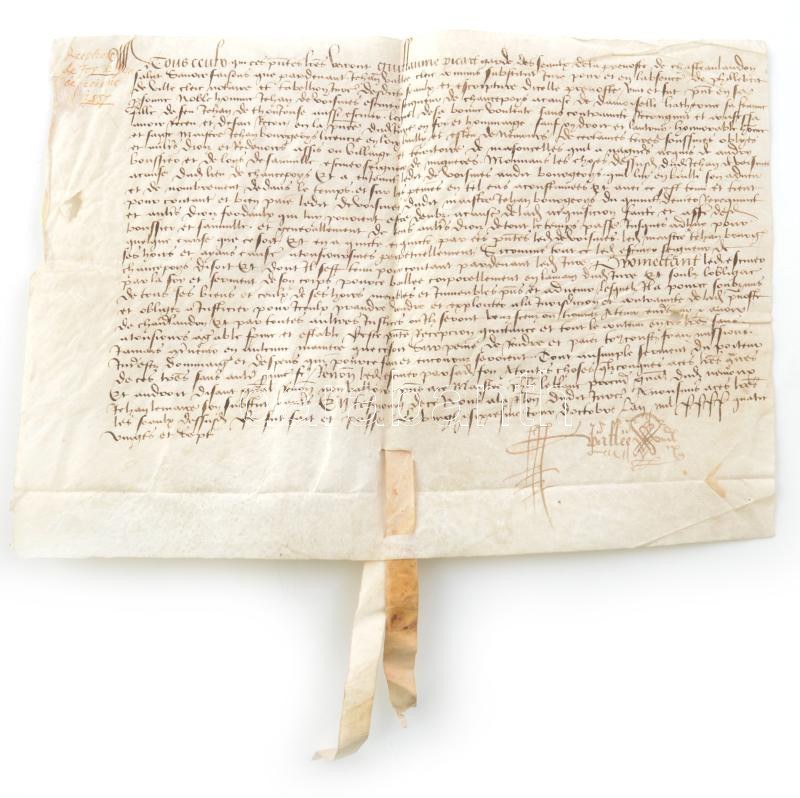 1487 Landon, Franciaországban kiállított kilépési engedély rendből? Pergamen, aláírt / Pergamin document signed in Landon, France in 1487. 32x22 cm