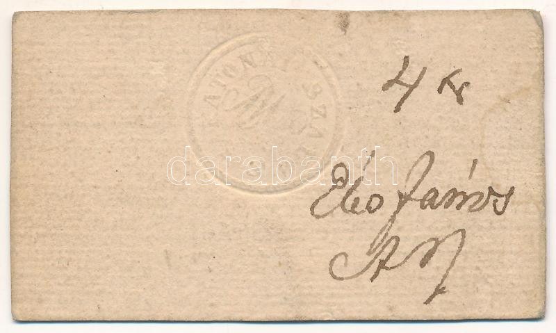 1800-1900 k. "Katonai szállás" szárazbélyegzővel ellátott, merített vastag karton lapka rajta fekete tintás kézírással "4kr Éles János (...)" (42x73mm) T:AU / Hungary ~1800-1900. "Katonai szállás (Military Accomodation)" embossed stamp on thick cardboard chip, with handwritten black ink "4kr Éles János (...)" (42x73mm) C:AU
