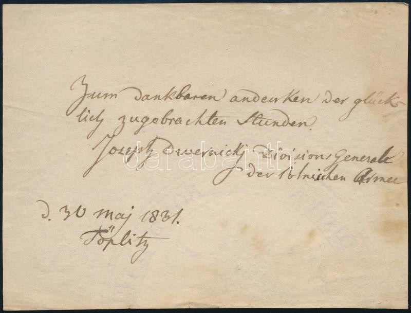 1831 Josef Dwernicki (17979-1857) lengyel lovas tábornok kétsoros saját kézzel írt és aláírt köszönete a szerencsésen eltöltött órák emlékére