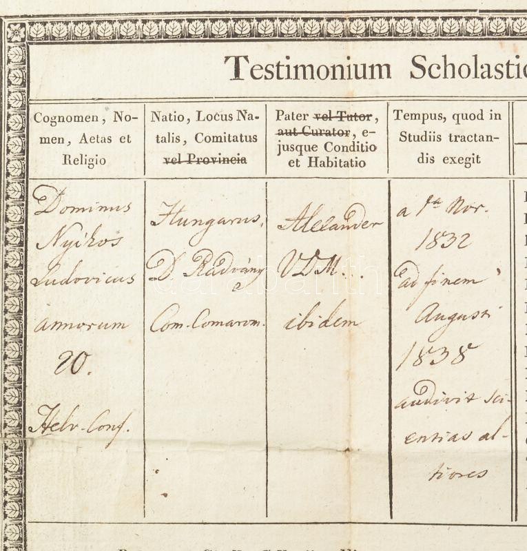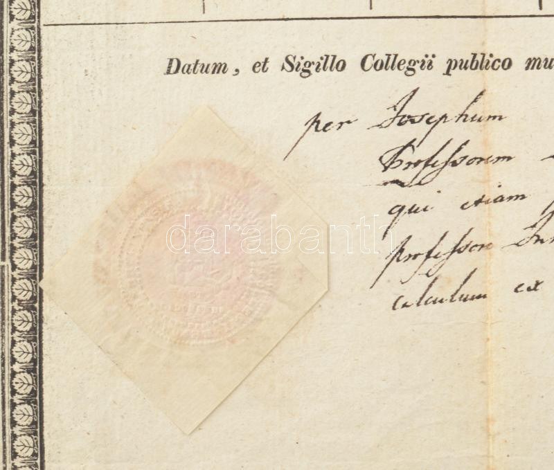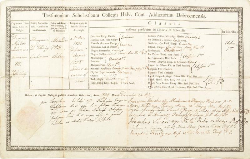 1839 Debreceni Református Kollégium bizonyítványa, aláírásokkal. Kerekes Ferenc matematikus, Kalós Mózes, Aranyi Istvány, Zákány József, Vecsei József filozófus, Csécsi Nagy Imre orvos, Péczely József történész. Kis szakadással. 44x27 cm
