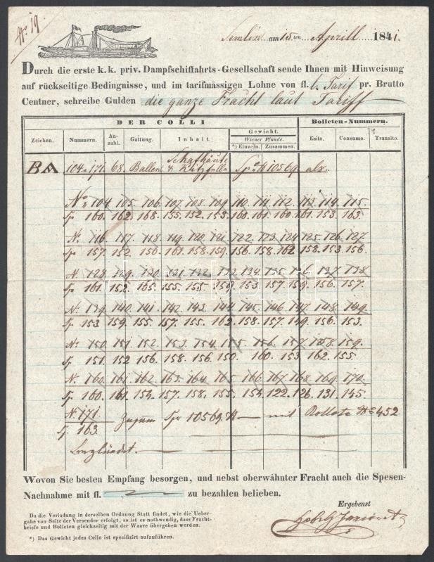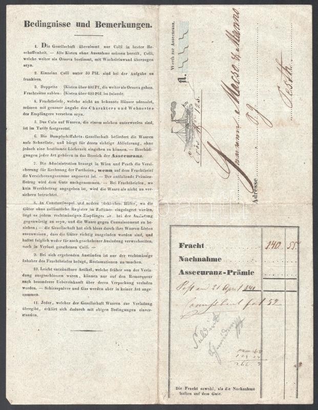 1841 Hajós fuvarlevél Pestre Erős hajó / Erős ship bill of freight
