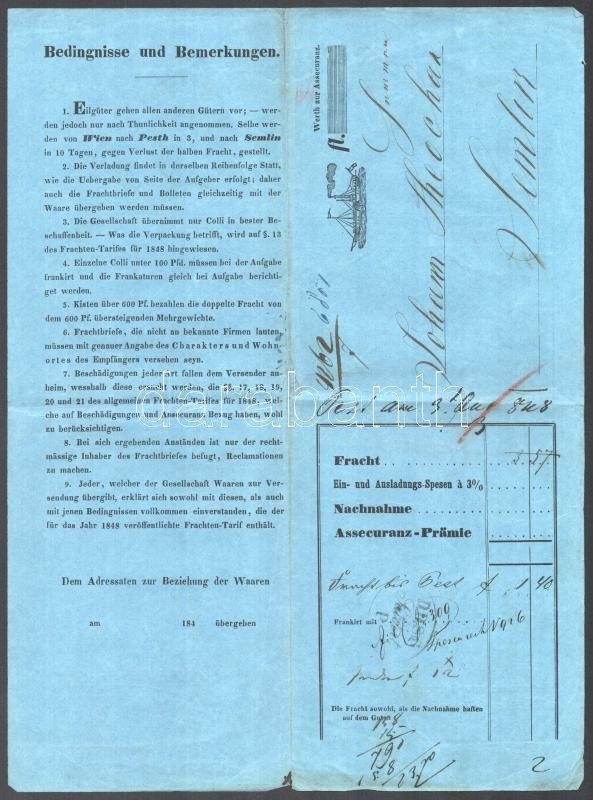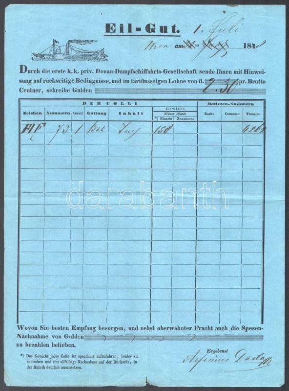 1848 DDSG Hajós fuvarlevél Bécsből / DDSG ship bill of freight