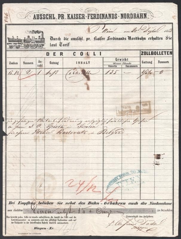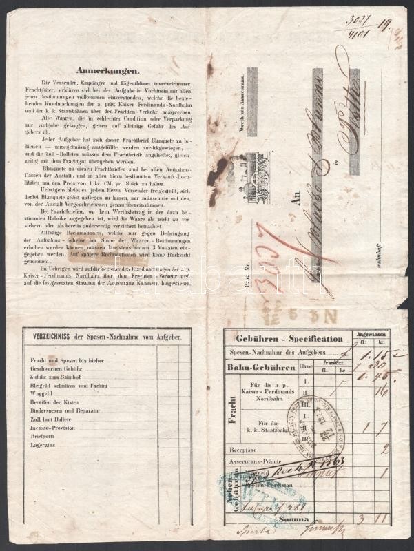1853 Ferdinánd Északi Vasút fuvarlevél / North railways bill of freight