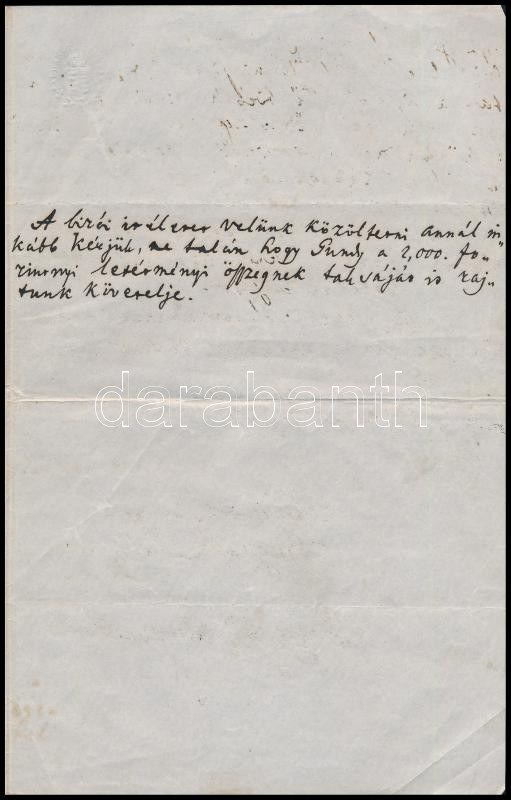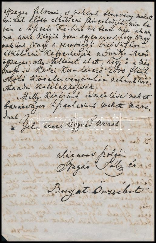 1862 Bugát Pál (1793-1865) a Királyi Magyar Természettudományi Társulat elnökének (1841-1844, 1848-1850, 1861-1864) saját kezű sorai "Igen Tisztelt Ügyvéd Úr!" megszólítással, bírósági ügyben, saját kezű aláírásával, valamint "Bugát Örzsébet" aláírásával, a papíron nemzeti kiscímeres, ún. Kossuth címeres "Áldás Hazánknak" szárazbélyegzéssel, hajtásnyommal, 1,5 beírt oldal, 2 sztl. lev.