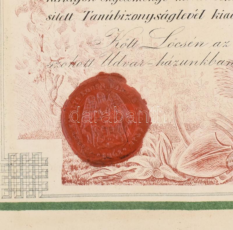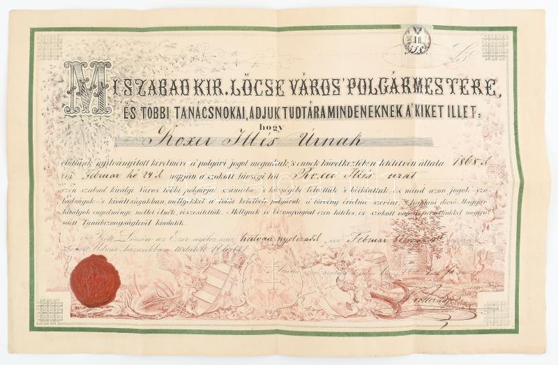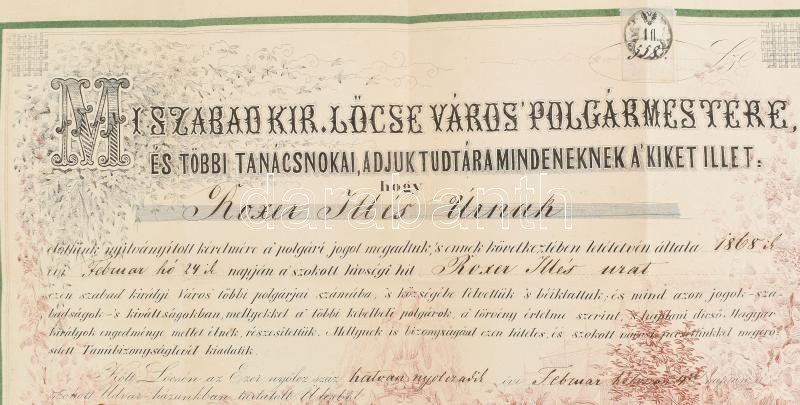 1868 Lőcse, városi polgárok közé felvételt igazoló oklevél a főjegyző aláírásával 1Fl illetékbélyeggel. Litográfia ...