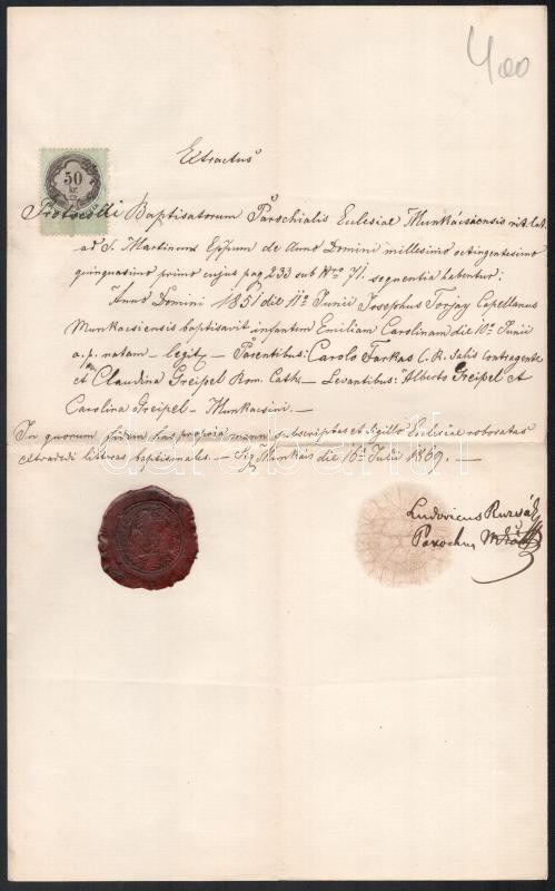 1869 Munkács, anyakönyvi kivonat. Ruzsák Lajos plébános aláírásával