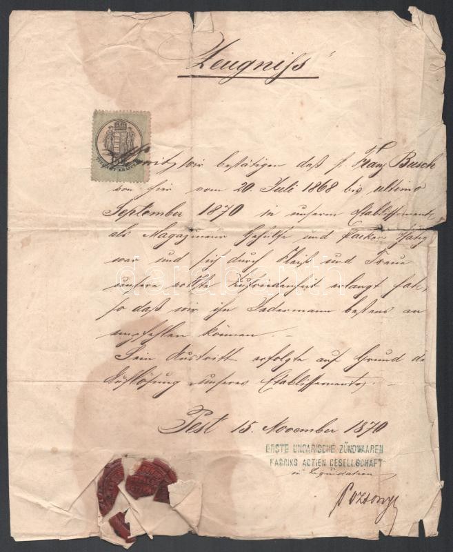 1870 Erste Ungarische Zündwaaren Fabriks Actien Gesellschaft (Első Magyar Gyuszer-gyár Rt.) munkáltató igazolása (1868. nov. 20. - 1870. szeptember.), német nyelven. Pest, 1870, nov. 15., 15 kr. okmánybélyeggel, szakadozott, sérült pecséttel, aláírással, szakadozott.