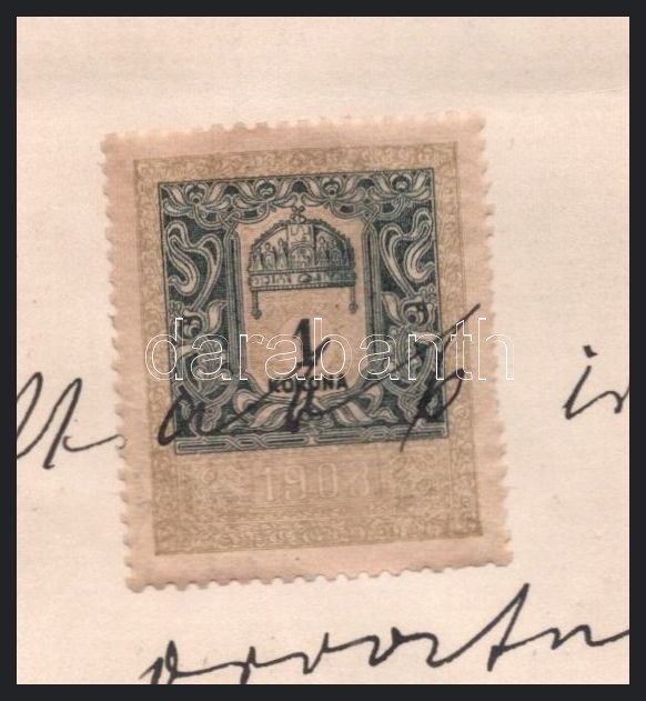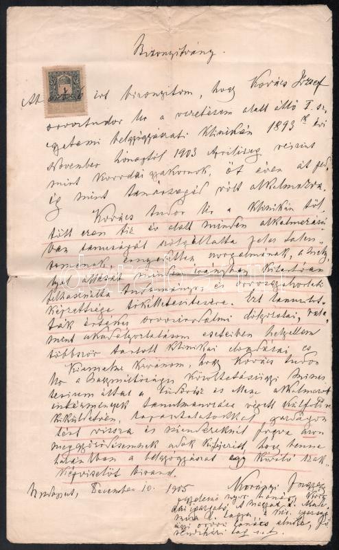 1905 br. Korányi Frigyes (1827-1913) által kiállított orvosdoktori munkáltató bizonyítvány, ami szerint Kovács József orvosdoktor a vezetése alatt álló I. sz. egyetemi belgyógyászati klinikán nála állt alkalmazásban, Korányi Frigyes saját kezű aláírásával,1 K okmánybélyeggel, hajtott.