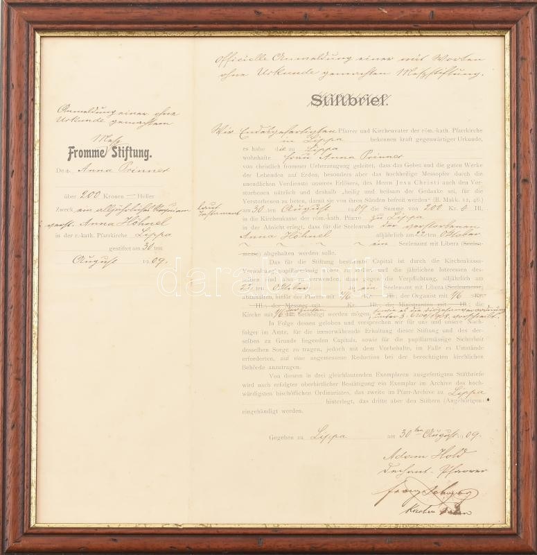 1909 Lippa, halálozási évfordulón tartandó mise díjának befizetéséről szóló egyházi elismervény, német nyelven, üvegezett keretben