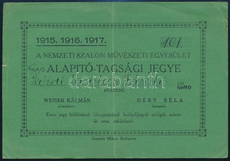 1915-17 Kézdi-Kovács László (1864-1942) festőművész, műkritikus nevére kiállított, 101. sz. Nemzeti Szalon Művészeti Egyesület alapító-tagsági jegye, hajtásnyommal, apró sérülésekkel, 9x13 cm