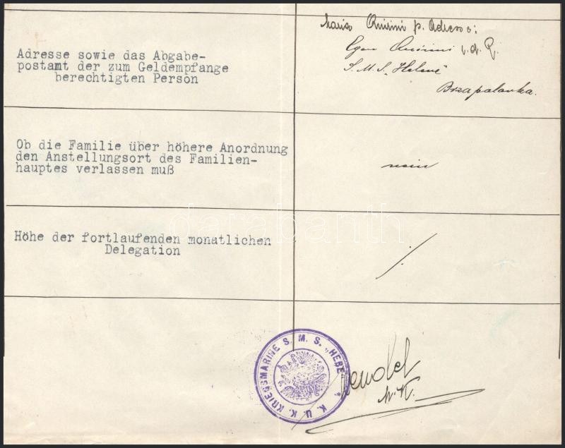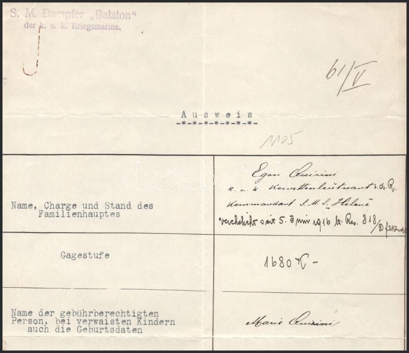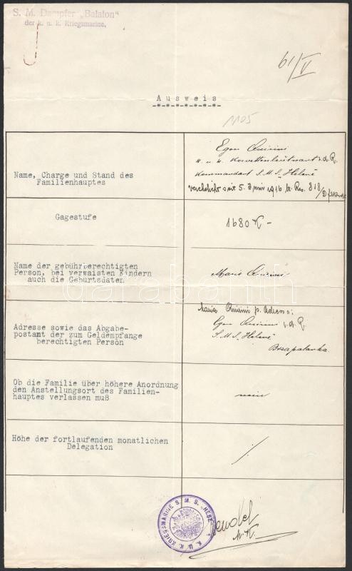 1915 Dunai Flottilla. Egon Quirini (tartalékos) Korvettenkapitány gépelt személyi lapja az S.M.S. Helene gőzhajó parancsnokaként, 1916. január 5-i hatállyal. S.M.D. Balaton és S.M.S. Hebe hajópecsétje // Danube Fleet. Typewritten appointment of Korvettenkapitän Egon Quirini (Reserve) as commanding officer of the armed steamer S.M.S. Helene, effective on January 5, 1916. K. U. K. KRIEGSMARINE S.M.S. HEBE Kalis/Kohl No. 1[type DR 1d] violet ? 300 points and S.M. Dampfer ?Balaton? der k.u.k. Kriegsmarine Kalis/Kohl No. 3 [type DL 2b