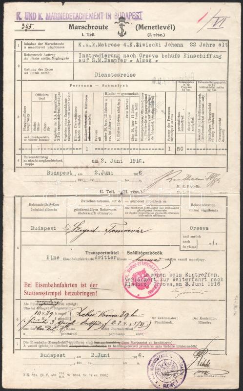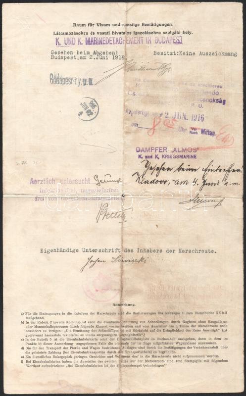 1915 S.M.D. Álmos Dunai Flottilla hajója Menetlevél egy matróz részére. Budapest-Pancsova. // Danube Fleet. Official Marching Orders from the k.u.k. Marinedetachment in Budapest for Seaman Fourth Class Johann Siwiecki, 22 years old, to report to Pancsova to join S.M. Dampfer Almos. The printed form contains at least six seals and rubber stamps, including: DAMPFER ALMOS K. und K. KRIEGSMARINE Kalis/Kohl No. 3 [type DL 2d] violet