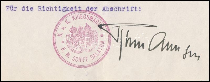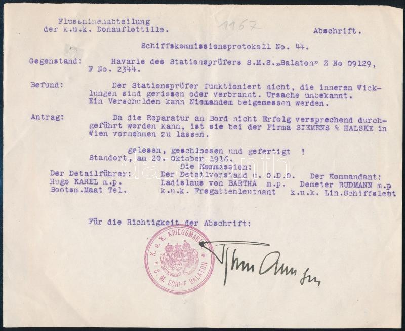 1916 Dunai Flottila.S.M. S. Balaton. Parancs az S.M.S. Balaton egy berendezésének javítására a bécsi Siemens & Halke által, mivel a fedélzeten nem javítható. A parancsot a felelős bizottság három tagja jegyezte. Az egyik a parancsnok, Demeter Rudmann Linienschiffleutnant (született 1889-ben, 1914. november 1-jén jegyezték be Linienschiffleutnantnak); a második a G.D.O., Ladislaus Bartha von Dalnokfalva Fregattenleutnant (született 1893-ban, 1916. november 1-jén jegyezték be Fregattenleutnantnak ? tíz nappal azelőtt, hogy új rangját ezen a dokumentumon feltüntette); a harmadik Hugo Karel, a távírószolgálat vezetője. Ritka hajópecséttel. // Danube Fleet, S.M.S. Balaton Order for the repair of a piece of equipment of S.M.S. Balaton by Siemens & Halke in Vienna, as it cannot be repaired on board. The ?inner windings are cracked or burnt. Reason unknown. No fault can be attributed to anyone,? the order dated October 20, 1916, states. It is signed by the three members of the commission in charge. One is the commanding officer, Linienschiffleutnant Demeter Rudmann (born in 1889, gazetted Linienschiffleutnant on November 1, 1914); the second is the G.D.O., Fregattenleutnant Ladislaus Bartha von Dalnokfalva (born in 1893, gazetted Fregattenleutnant on November 1, 1916 ? ten days before he used his new rank on this document); third one is Hugo Karel, a seaman in charge of the telegraph. K.u.K. KRIEGSMARINE * S.M. SCHIFF BALATON * This seal of the DK 5c-type (one double ring, double coat of arms) is not listed in Kalis/Kohl for S.M.S. Balaton