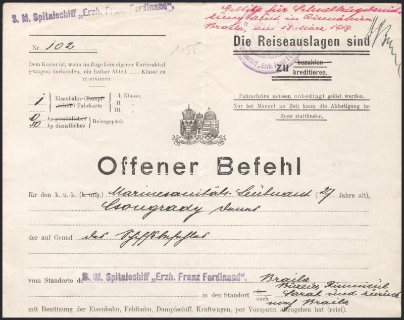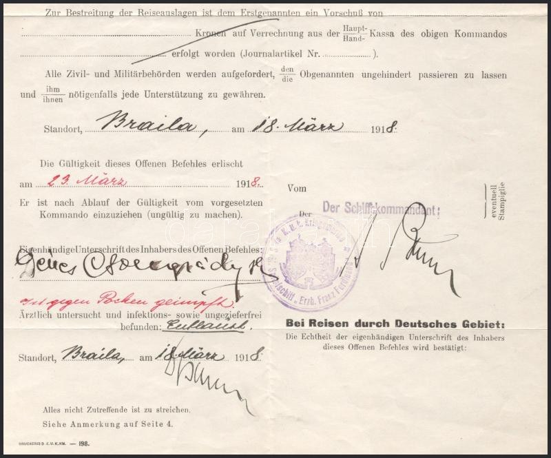 1918 Dunai Flottila. Nyílt parancs D. Csongrady hadnagynak és az Erzh. Franz Ferdinand kórházhajó matrózának egy oda-vissza vasúti utra Brailából egy olvashatatlan nevű román városba. Kelt Brailában, 1918. március 18-án. A parancsnok és Csongrady hadnagy aláírása. Ritka hajópecsétekkel // Danube Fleet. Offener Befehl issued to 27-year old medic Leutnant D. Csongrady, with S.M. Spitalschiff ?Erzh. Franz Ferdinand? for a roundtrip by rail from Braila to a Rumanian town the name of which is illegible. Dated in Braila, March 18, 1918. Signed by the commanding officer and by Lt. Csongrady. K.u.k. Kriegsmarine S.M. Spitalschiff Erzh. Franz Ferdinand. Kalis/Kohl No. 1 [type DK 5c] and S.M. Spitalschiff Erzh. Franz Ferdinand (85 mm x 4 mm) Kalis/Kohl No. 2 [type DL 1b]