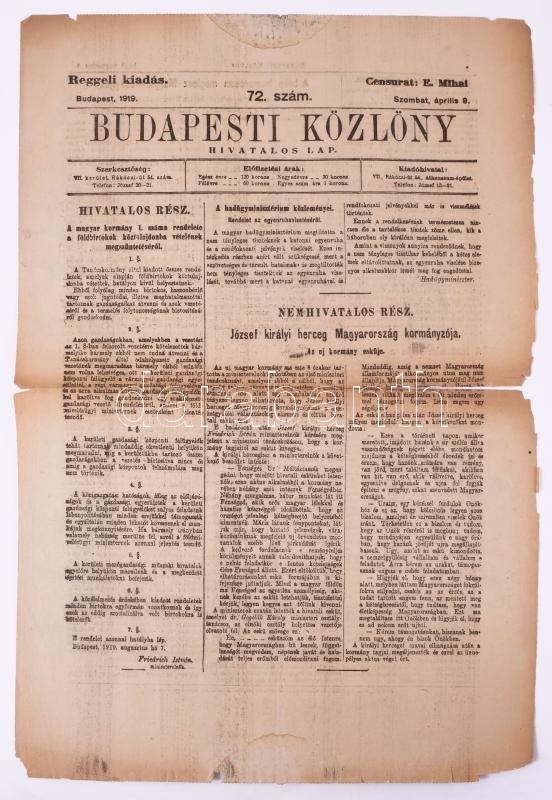 1919 Bp., A Budapesti Közlöny 72. száma, román cenzúrával