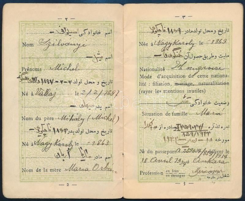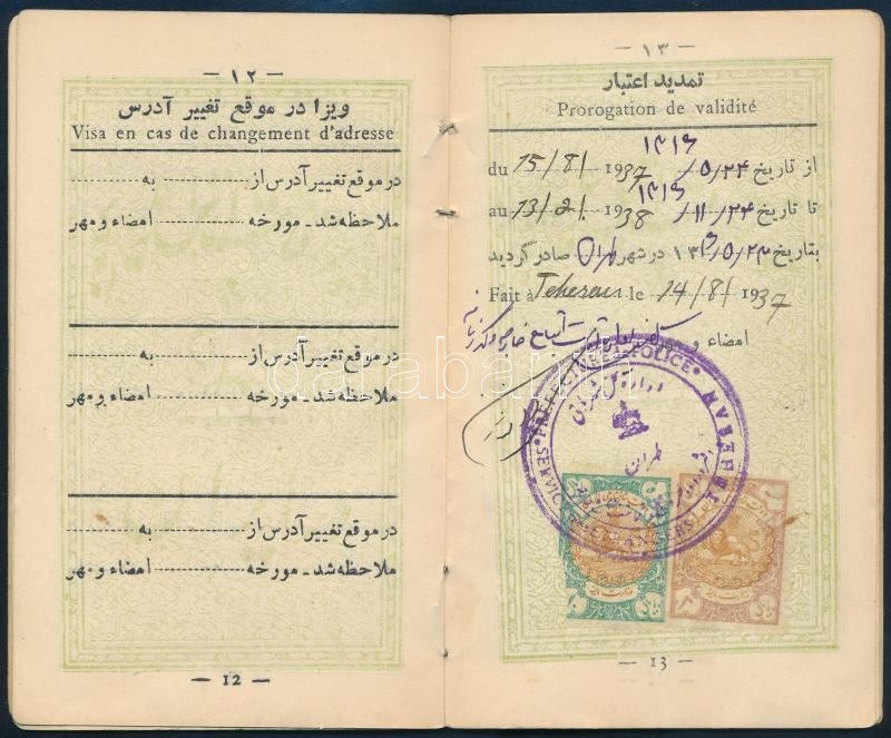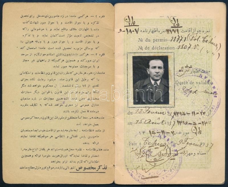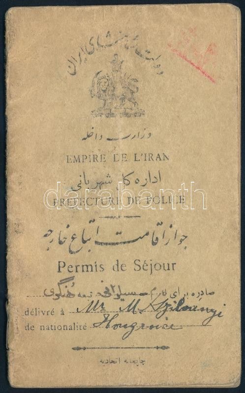 1937 Iráni fényképes tartózkodási engedély (Permis de Séjour) magyar személy (Michel (Mihály) Szilványi részére), francia és iráni nyelven. / Iran, residence permit for a Hungarian person, in Iranian and French language